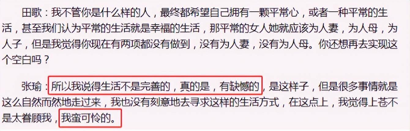 相反,张建亚在2000年嫁给了一个外地人,并在2001年有了孩子。 “一切的感情,在分开的时分都愈加可贵。”张瑜对张建亚的感情就是这样。 田歌曾经问过张瑜说:“我以为女人还应该有妻子和母亲的身份才算完好,而你两者都没有,你想过要做什么吗?” 张瑜说:“所以我的人生有差距,有遗憾,我觉得自己还很穷。”