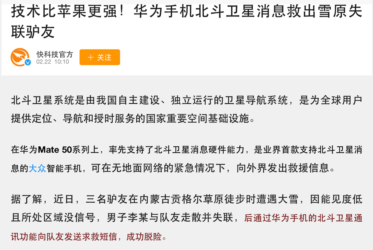 早在2022年,华为就将卫星通讯技术应用到手机上,华为Mate50系列就搭载了这项卫星通讯“黑科技”,并且在一些关键状况下起到了重要的作用,一位驴友在驴友在内蒙古贡格尔草原徒步过程中,因迷路无法按时返回商定汇合地点,在手机没有信号的状况下借助手中华为Mate50手机的卫星通讯功用向队友发送求救信号,从而获救。