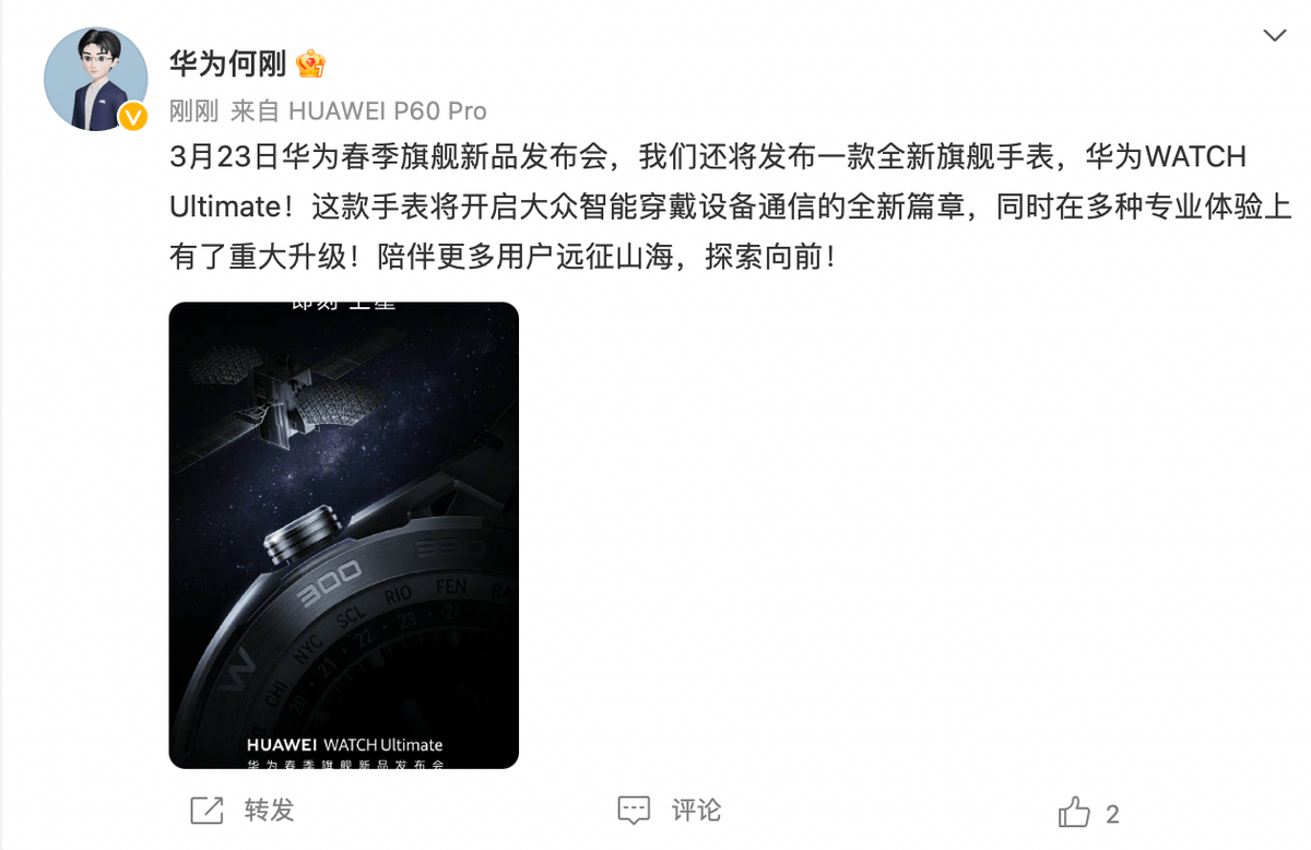 华为在3月23日将会召开2023年华为春季旗舰新品发布会,最让宽广消费者等候的就是华为将推出全新华为WATCH Ultimate系列的手表了。依据@华为终端微博爆料的海报能够看出,海报中有若隐若现的卫星图像,猜测新款手表将支持卫星通讯功用。这一音讯一经推出便惹起了众多网友的讨论,使许多消费者充溢了等候。