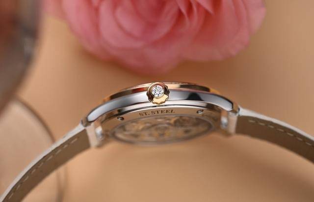 18K玫瑰金表冠上镶嵌一颗钻石,表冠别致的外型像是一顶“王冠”,同时十分便于日常操作。