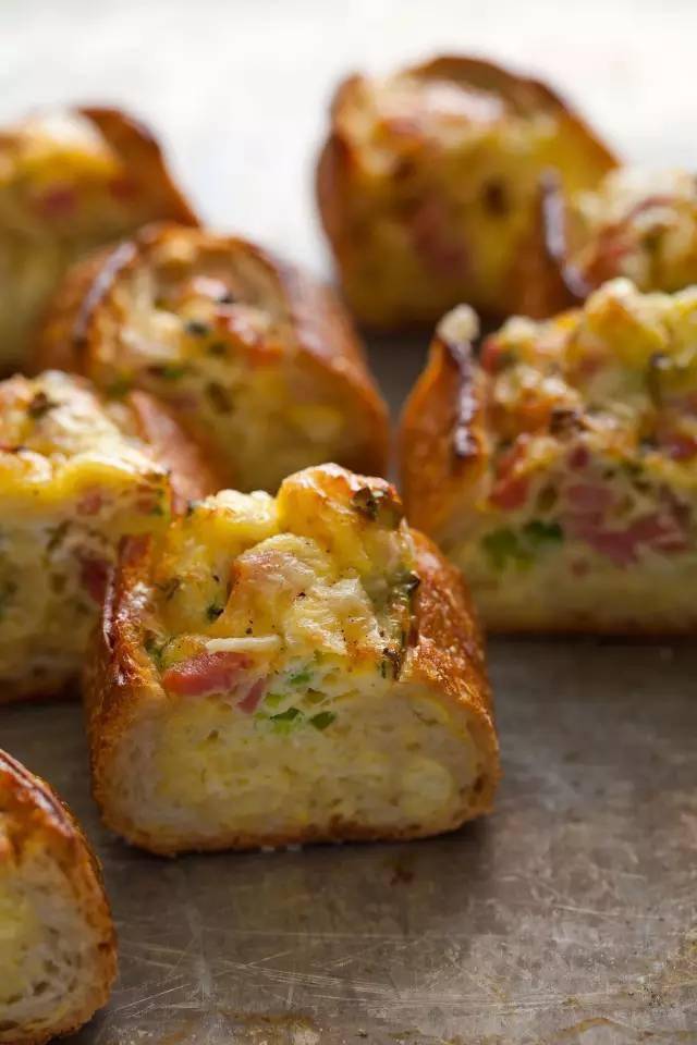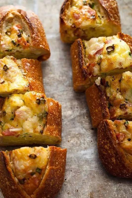 短法棍(或小号吐司) 2个 鸡蛋 5个 淡奶油 83ml 培根 110g 格鲁耶尔奶酪(或马苏里拉、车达、帕玛森等硬质干酪) 85g 香葱 2根 食盐 少许 黑胡椒粉 少许 橄榄油 少许 ①首先用小刀在法棍(或吐司)的顶部划出一个“V”字型的凹槽,备用 ②培根切成碎粒,平底锅内参与少许橄榄油(一丁点儿就好啦),将培根丁煸出肥油,放入法棍之中 ③鸡蛋、淡奶油混合打散,参与黑胡椒粉与食盐调味;将做好的蛋液倒入法棍之中,备用 ④将格鲁耶尔奶酪擦成碎末,与香葱碎一同撒在面包名义,在面包名义再撒上少许食盐和胡椒粉调味 ⑤烤箱预热上下火175度,烤箱中层烘烤20-25分钟,至名义呈现金黄色,即可取出,放至微凉后切块食用
