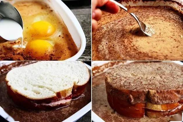 ⑤将牛奶、肉桂粉、鸡蛋混合打匀,制成浸取用蛋液,将填好夹馅的吐司放入蛋液之中,使蛋液浸入吐司之内(两面都要浸入)