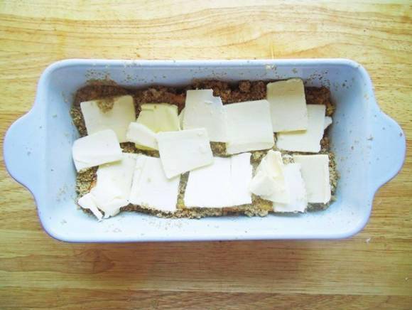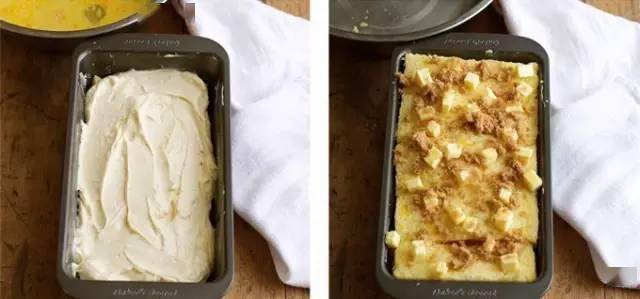 ⑦将奶油奶酪馅儿填在吐司片上,盖上剩下的吐司片,将装饰中的无盐黄油切成小块,与红糖一同撒在吐司的名义 ⑧烤箱预热上下火180度,烤箱中层烘烤约30分钟,待顶部呈现金黄色色泽,盖上锡纸,再烤约10分钟