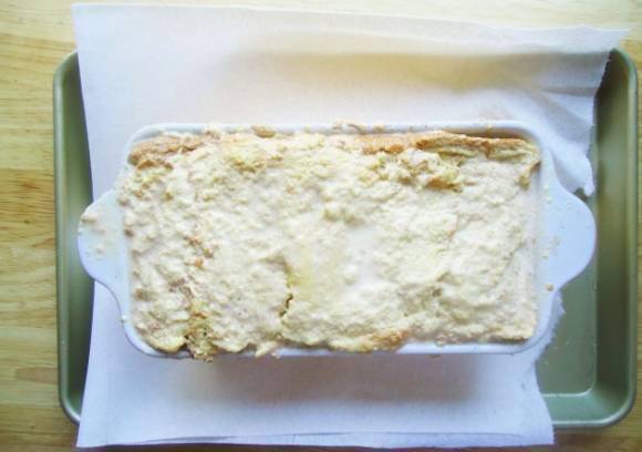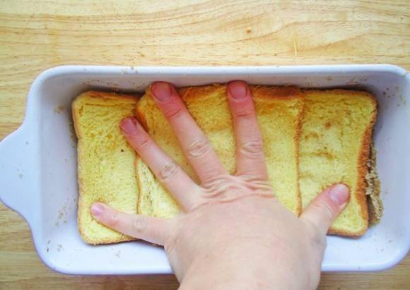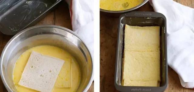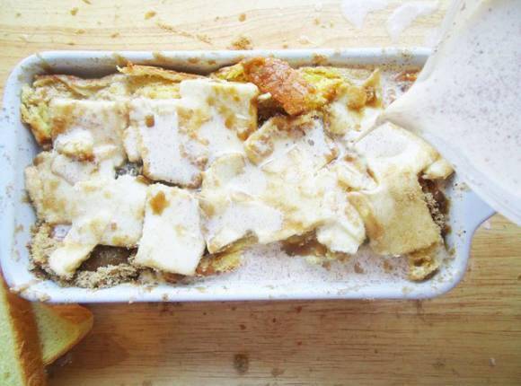 ⑤将步骤2的混合物缓缓地倒入到容器之中(液体混合物能够没过吐司),将混合物送入冰箱冷藏过夜(至少6个小时)