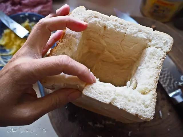 吐司 1/2个 马苏里拉奶酪碎 135g 烟熏火腿 100g 番茄酱 63ml 黄油 适量 ①首先在吐司内部掏出一个正方形的洞,将多余的吐司内心挖出;在吐司名义抹上一些软化的黄油,备用