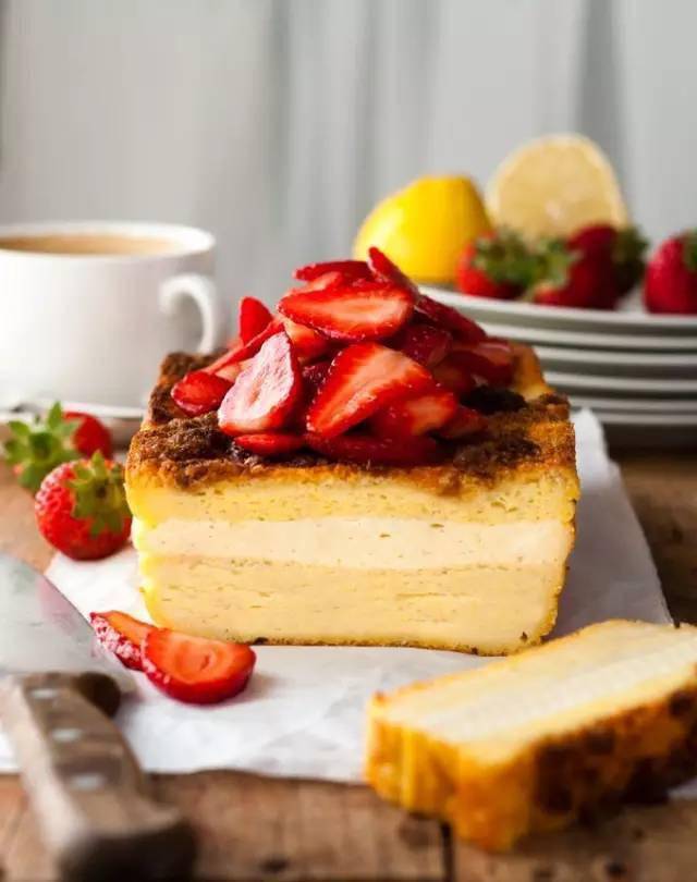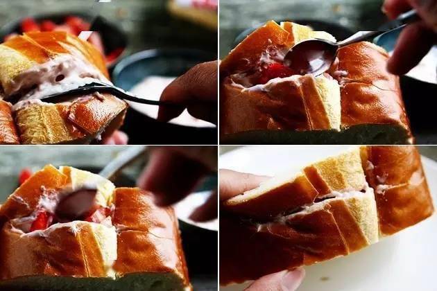 ⑨将烤好的面包取出,放置5-10分钟,待面包不是特别烫手时,将面包取出脱模 ⑩将装饰的草莓切片,参与少许砂糖,腌出水分,放于面包名义,即可完成 TIPS 最好运用新颖的吐司制造奶油奶酪吐司包。