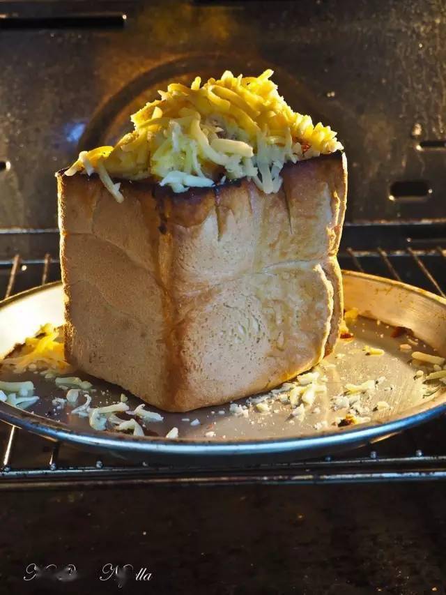 ③将掏出的一部分面包心切成四方形的小块,刷上少许消融的黄油,再填回吐司之内 ④烤箱预热上下火180度,烤箱中层烘烤8-10分钟,使马苏里拉奶酪完整消融,取出 ⑤将剩下的烟熏火腿粒填入吐司之中,在火腿上撒上剩下的马苏里拉奶酪 ⑥将吐司送回烤箱,180度烤至顶部的奶酪完整消融,即可完成