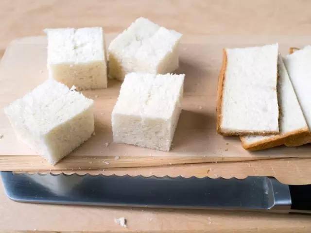 吐司 1/2个 无盐黄油(消融) 60ml 蜂蜜 15ml 抹茶粉 3g 抹茶冰淇淋 少许 ①将吐司切成5cm左右的厚片,修去四边,切成边长为5cm左右的正方形面包块儿