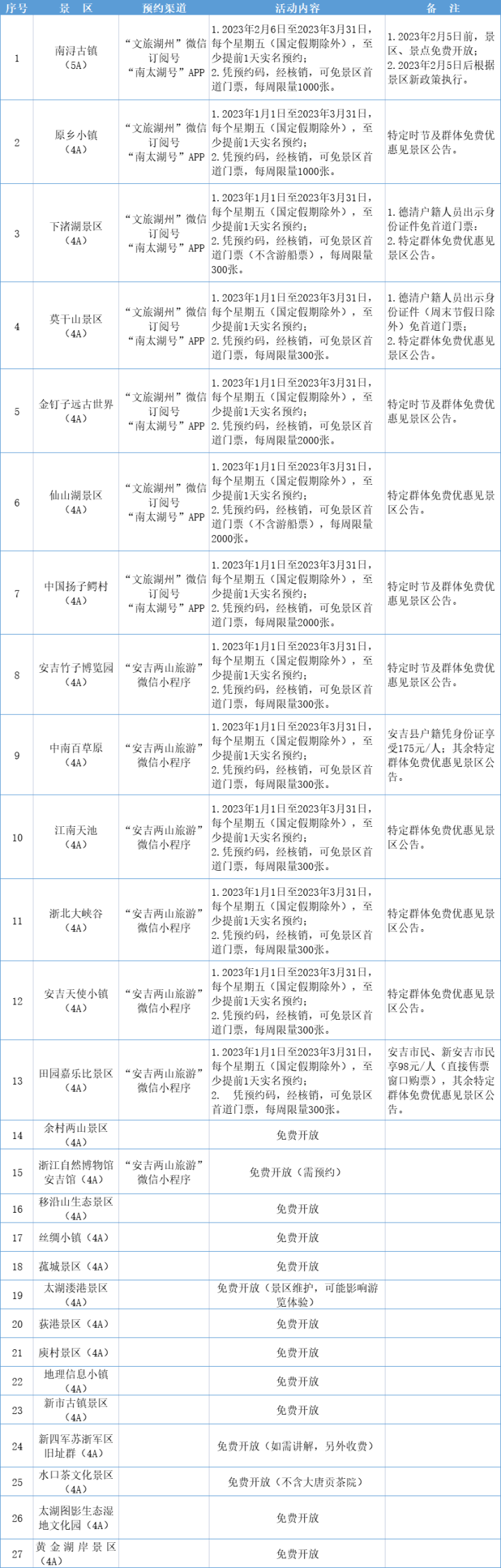 滑动查看下一张图片 湖州 湖州市文化广电旅游局于2023年1月1日—3月31日展开“相约星期五、免费游湖州”文旅惠民活动,每周五全市27家4A级及以上景区向游客免费开放,本次活动细致包含这些景区: