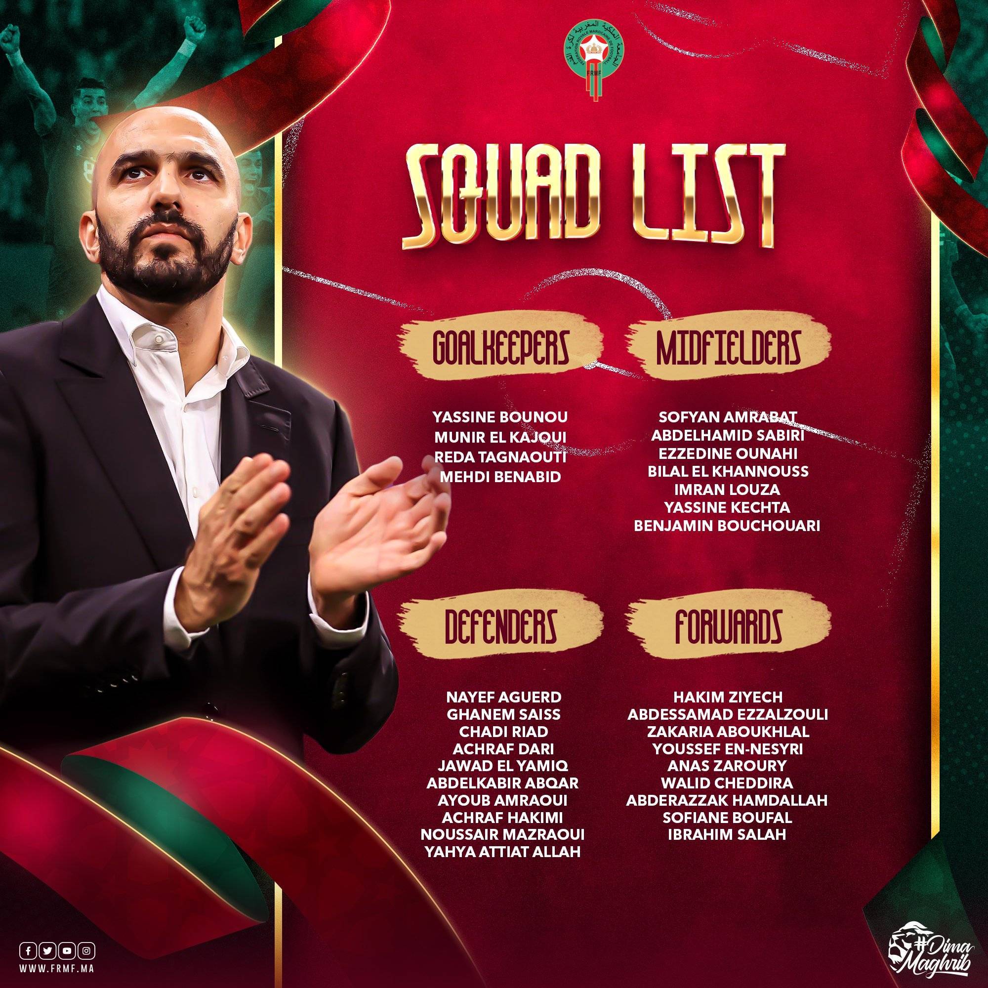 直播吧3月13日讯 摩洛哥国度队最新一期大名单发布,齐耶赫、阿什拉夫领衔,马兹拉维、恩内斯里入选。 目前摩洛哥主帅为瓦利德-雷格拉吉,他带领摩洛哥在卡塔尔世界杯闯入四强,入选了2022年度最佳教练候选五人。 大名单如下: 门将:亚辛-布努(塞维利亚)、穆尼尔-穆罕默德(瓦赫达麦加)、里达-塔格诺提(卡萨布兰卡维达德)、迈赫迪-贝纳比德(FUS拉巴特) 后卫:纳耶夫-阿格德(西汉姆联)、罗曼-赛斯(贝西克塔斯)、查迪-里亚德(巴萨竞技)、阿什拉夫-达里(布雷斯特)、埃尔-亚米克(巴拉多利德)、阿布戴尔-阿布卡尔(阿拉维斯)、阿尤布-阿姆拉维(OGC尼斯B)、阿什拉夫-哈基米(巴黎圣日耳曼)、诺赛尔-马兹拉维(拜仁慕尼黑)、阿蒂亚特-阿拉尔(卡萨布兰卡维达德) 中场:索非亚-阿姆拉巴特(佛罗伦萨)、阿卜杜勒哈米德-萨比里(桑普多利亚)、阿兹-埃丁-奥纳西(马赛)、比拉尔-埃尔哈努斯(亨克)、伊姆兰-路萨(沃特福德)、亚希内-科齐塔(勒阿弗尔)、本杰明-布沙瓦里(圣埃蒂安) 前锋:哈基姆-齐耶赫(切尔西)、阿布德-埃扎尔祖利(奥萨苏纳)、约瑟夫-恩内斯里(塞维利亚)、阿纳斯-扎鲁里(伯恩利)、瓦利德-切迪拉(巴里)、阿德拉扎克-哈姆达拉(吉达分离)、索非亚尼-布法尔(赖扬)、易卜拉欣-萨拉赫(雷恩) 3月26日,摩洛哥队将在友谊赛上与巴西队交手。 |