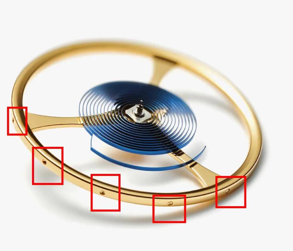值得留意的是3001机芯的摆轮上做了一个很巧妙的设计,传统的莲花摆轮有抵消温差形变战争衡摆轮的作用,但是由于Nomos超薄,并且莲花摆轮风阻很大,所以说3001设计的了这种轻轻凸起的圆钉镶嵌摆轮,既能够抵御温差形变,又不会加大风阻,一箭双雕!也展示了精密加工的益处!