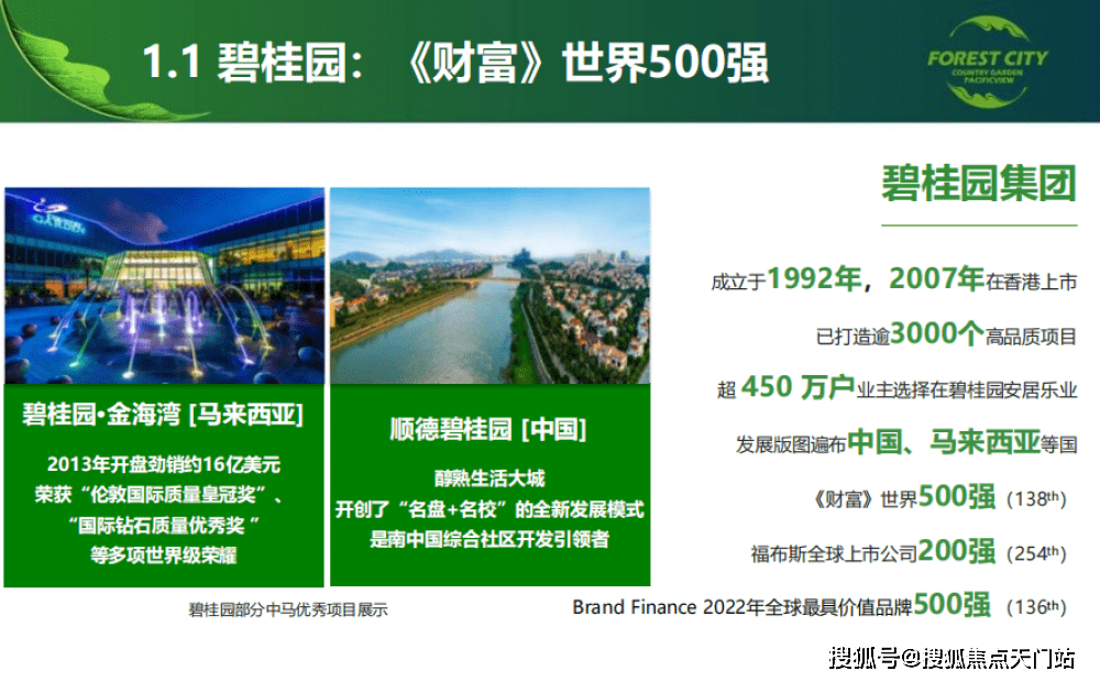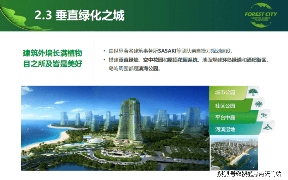 碧桂园森林城市为生态环境做出的努力 碧桂园森林城市旨在打造一个宜人居所和海上绿洲,其人工岛的外形并不是随意设计和随意建造,而是经过精密计算得出,是由专业顾问在项目毗连海域柔佛海峡放置传感器获取数据之后,用计算机中止模型模仿,再经过察看人工岛对水流速度、水质惹起的变更,从而最终肯定人工岛的外形。并且在填海过程中的防沙网项目专项投入超越了2000万马币,最大限度的降低以至消弭填海对周边区域的影响。另外经过在环海岸线树立红树林边疆抵达消浪护堤、净化海水和空气的功用;除此之外,经过采取科技化的建造工艺,全城搭建垂直绿墙、屋顶绿化系统和空中花园,力图抵达节能减排和观赏价值谐和并存的现代绿色住区,是执行生态环境维护理念的模范。 垂直绿化设计 森林城市基于碧桂园的开发阅历和设计理念,旨在营造健康自然的寓居环境,在设计之初就估量抵达100%的绿化率,让住户目之所及皆是森林。碧桂园分离美国SASAKI建筑与环境建筑设计事务所、德国艾巴维/普瑞集团、德勤等国际专业团队中止设计开发,采用垂直绿化设计,全城搭建垂直绿墙、空中花园和屋顶花园系统,构成多维度平面绿化系统,其中平面绿化面积为271万平方米,垂直绿化约为25.6万延米,完成了植物固碳、减少热岛效应、降低温控系统能耗的效果。 产城融合规划 2020年碧桂园森林城市向公众公开了《森林城市生态展开行动指南》,该纲要明白提出了森林城市的生态展开主张。遵照这一主张,森林城市将以绿色生态展开作为城市基础树立地板,以高科技产业为城市经济展开赋能,成为产城一体、多元文化融合的绿色生机之城。其中,该纲要将森林城市的生态展开规划为三个阶段: 第一阶段(2014年-2019年):城市绿色生态系统的基础阶段,用环保理念贯串城市规划、开发树立和城市运营。 第二阶段(2022年-2023年):产城一体化目的逐步完成,以电商中心、绿色聪慧产业、高科技产业等为代表的抢先产业范畴为森林城市展开赋能。 第三阶段(2023年及之后):构建城市展开与自然生态调和展开的城市绿色生态系统。