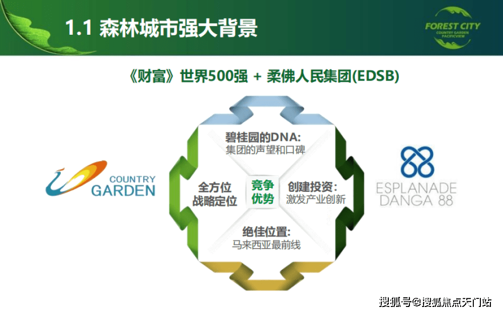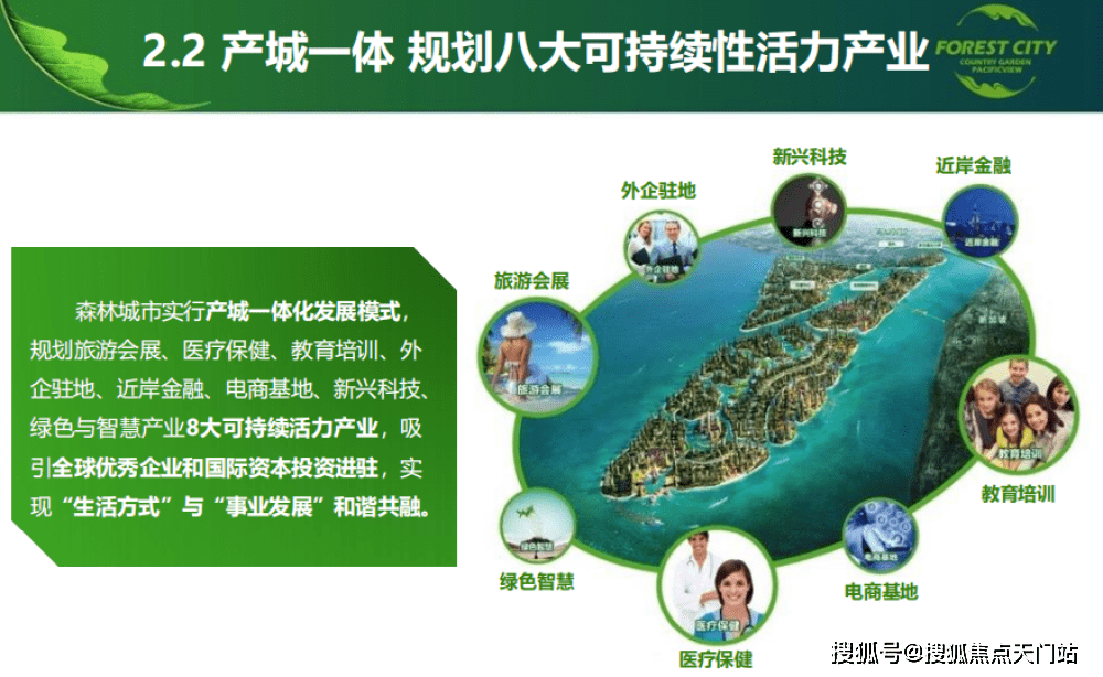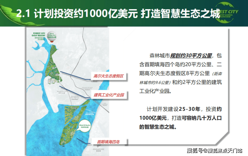 森林城市项目概述 碧桂园森林城市位于马来西亚柔佛州伊斯干达特区,与新加坡相隔。森林城市占空中积20平方公里,由4个岛屿组成,是碧桂园集团在海外建造的首座聪慧生态城市。2015年12月,碧桂园集团发表阐明森林城市项目将作为其在马来西亚聪慧建筑的最高代表作,估量总投资2500亿人民币,开发周期为30年。 森林城市项目又被称为“未来城市”,是碧桂园集团树立世界先进的城市设计理念的初次尝试,建筑外墙碧绿的植物也充沛反映了其绿色环保的概念。作为未来聪慧城市的代表,碧桂园集团在项目成立之初就延聘了国际知名咨询公司麦肯锡定制了一份森林城市产业链的完好计划。在规划中,碧桂园森林城市将导入旅游会展、医疗保健、教育培训、外企驻地、近岸金融、电商基地、新兴科技、绿色与聪慧产业八大产业,并构成集聚。