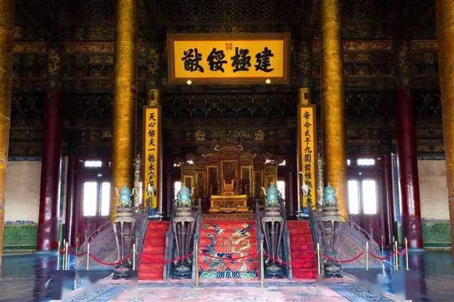 太和殿匾额:建极绥猷 帝命式于九围,兹惟艰哉,奈何弗敬 天心佑夫一德,永言保之,遹求厥宁 ——乾隆题 体仁阁对联