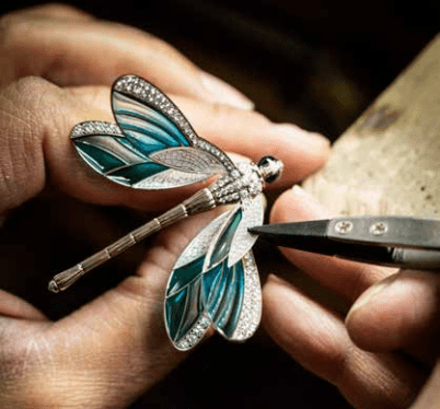 在铝轨上装嵌玉髓及自然群居网 50 片装饰宝石在机械作用驱 动下,在池中扬起波澜,构成 Fontaine aux Oiseaux小鸟喷泉自 动机械装置的诱人场景。玉髓与 自然群居网交错而成的水波映照流 光溢彩。工匠运用Mystery Set 隐密式镶嵌技术,把宝石一片一 片镶嵌于装置的镶轨上,演绎水 波的韵律,如水般温和起伏的效 果,是深化研讨的结晶。睡莲和莲 叶以铰链固定,可随水波荡漾。 蜻蜓 蜻蜓振翅起飞,盘桓于一泓碧水之上,其生动神韵表示了背地一个繁复 技术的研发过程。蜻蜓的肢体由头部、胸部及腹部三个部分组成,以镶 钻白K金铸造。衔接翅膀和足肢的胸部装嵌着微型装置,腹部则以一条 弹簧支撑。两对翅膀以不同频率颤动,蜻蜓回旋时,可从不同角度观赏 其漂亮姿势。缀有白色珍珠母贝的翅膀,嵌入金丝及彩绘玻璃珐琅,若 隐若现地透露突变虹彩。钻石的绚烂炫彩与珐琅、珍珠母贝的通透光泽 相互辉映。两颗凸圆型切割蓝宝石眼珠,为这件珍品画龙点睛。