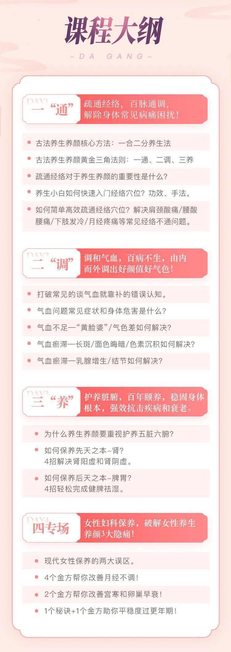 推出了《古法养生·驻颜美体》锻炼营。 通知女性,日常该怎样颐养自己。帮你尽可能做到:防病于已然,延缓衰老,焕颜美体。 课程只需1元。 给自己多一点耐烦 悄然变美,养护全家 假如你也想 告别色斑皱纹,无光泽黄脸 不再皮松肉跨,肚子赘肉一坨坨 不再胃胀打嗝,有口吻被厌弃 不再焦虑火暴,失眠多梦乏力没肉体 ...... 那么这套养生驻颜的 《古法养生·驻颜美体》很合适你 而且最重要的是,古法养颜好用不贵。 古方食养,以日常食材为原材,能够放心食用,也轻松易得。 也为此,我们还提供了一个机遇,能够把: