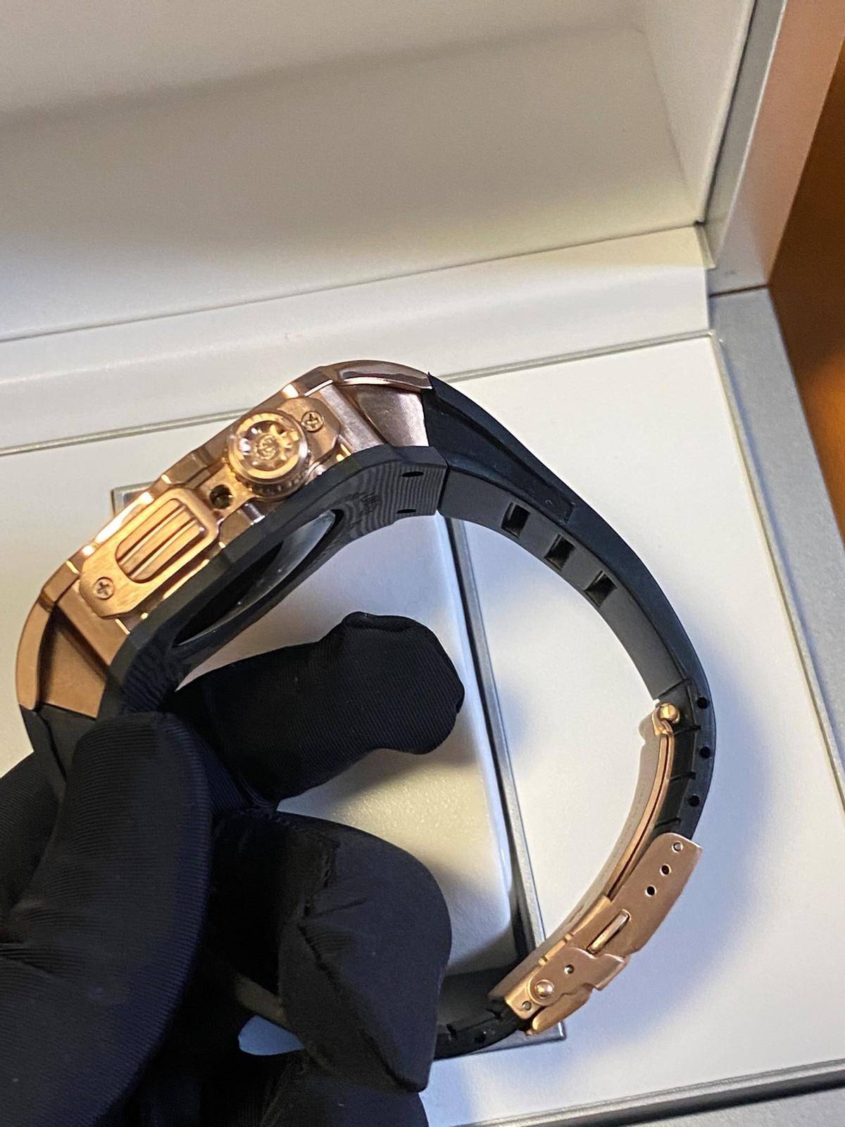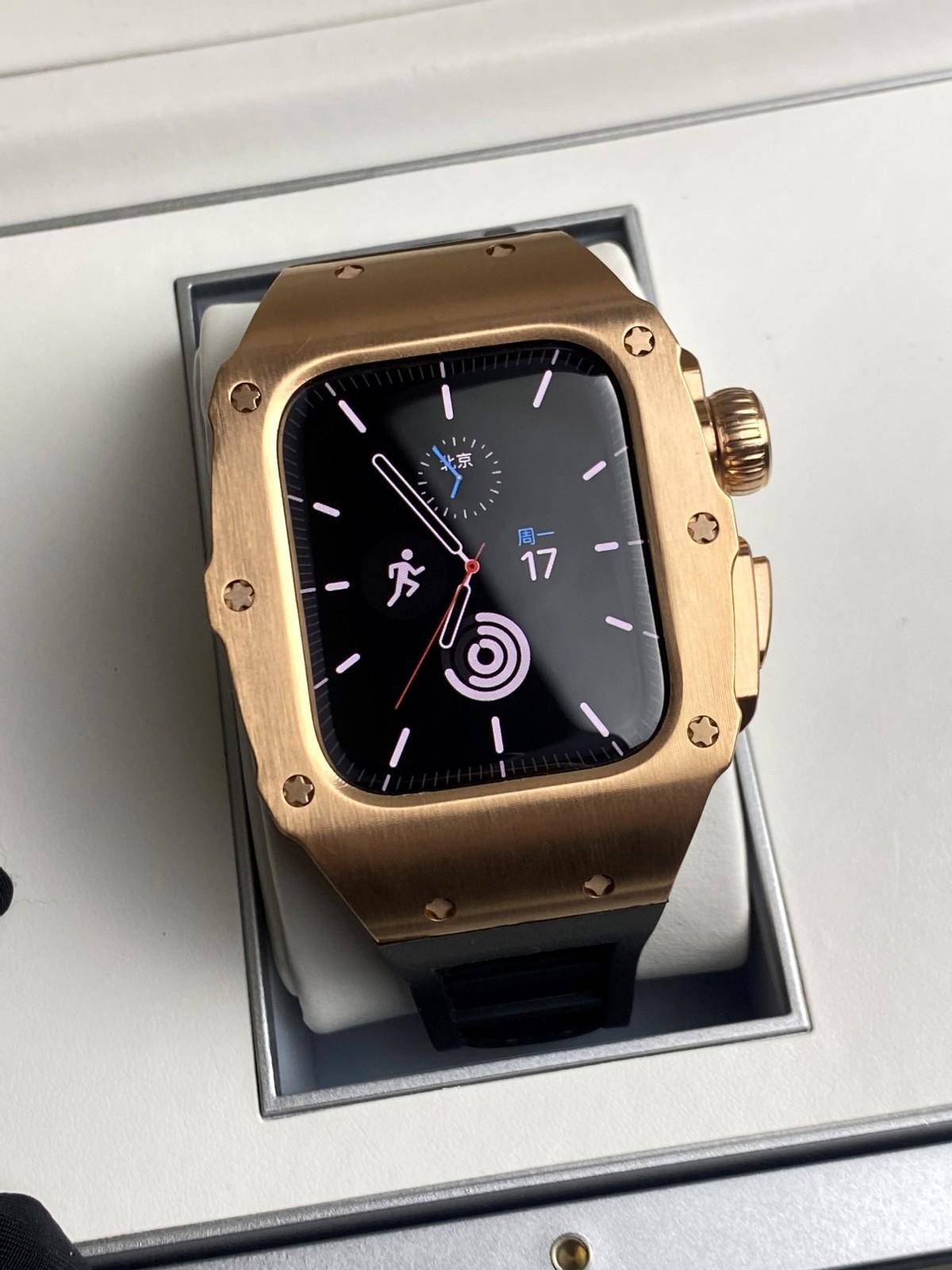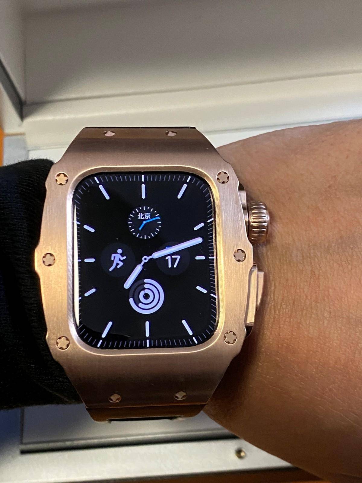 外观谁更胜一筹? 爱定族定制款的Apple Watch S7在外观上和原版相比,作风大变,玫瑰金的配色、酒桶装的外型、10颗夸大的螺丝钉的设计,直接跨界理查德米勒,既精致又硬核十足,十分具有机械范儿。表壳采用NTPT薄层复合技术制成的碳纤维资料,表壳质地愈加轻盈,还具有理想的防震性。表壳零部件也全部采用钛合金资料,硬度更高,质量更轻,更耐腐蚀,戴着手上能够明白感遭到钛金属轻量化的优点。