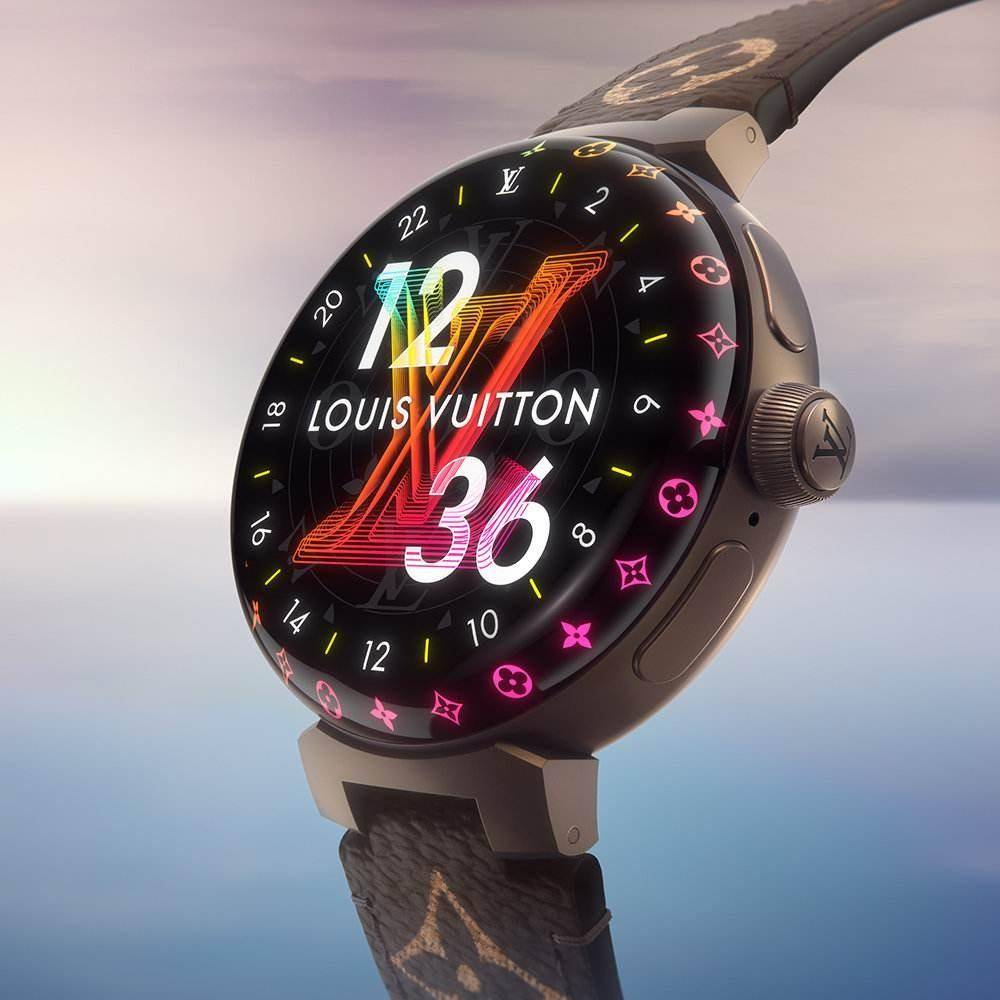 LV智能手表的外观,设计十分大胆,潮气十足,圆形的蓝宝石表盘、 整体看起来很有弧度,每一个细节都很顺滑,最引人注目的是周围一圈LV老花图案,收到新音讯时,图案还会五光十色的被点亮,十分炫酷。