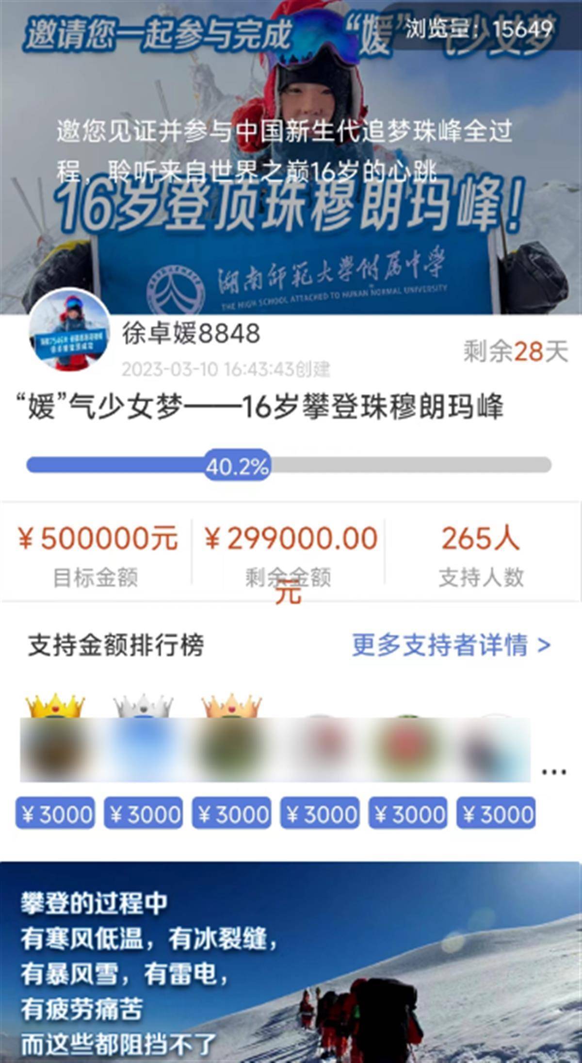 登顶胜利(来源:受访人众筹页面) 众筹50万元助力攀爬珠峰 3月13日,徐江雷通知极目新闻记者,登顶珠峰有两条道路:一条是从尼泊尔境内的南坡登顶,综合费用约为50万元;另外一条是从中国西藏一侧的北坡登顶,不外这首先要完成5000米、7000米和8000米的攀爬,然后最终登顶珠峰,总费用约为80万元。这次徐卓媛选择的是从南坡登珠峰,4月份徐卓媛将启程前往尼泊尔加德满都,准备在5月份向攀爬珠峰发起应战。 3月12日,徐卓媛在社交平台发布视频向网友分享自己的准备状况。她说,往常每天都在为登顶珠峰做准备,“究竟是世界之巅,将面临变更莫测的天气,无法预测的雪崩,还有8000米级山峰将遇到的高空风以及缺氧等构成的高原反响。”她往常每天会跑步6公里,做至少10组保加利亚深蹲和20公斤的负重爬楼锻炼,另外还要中止跳绳、游泳等心肺锻炼,估量将在5月20日至30日之间中止登顶珠峰应战,但细致日期还要看当时的天气状况。