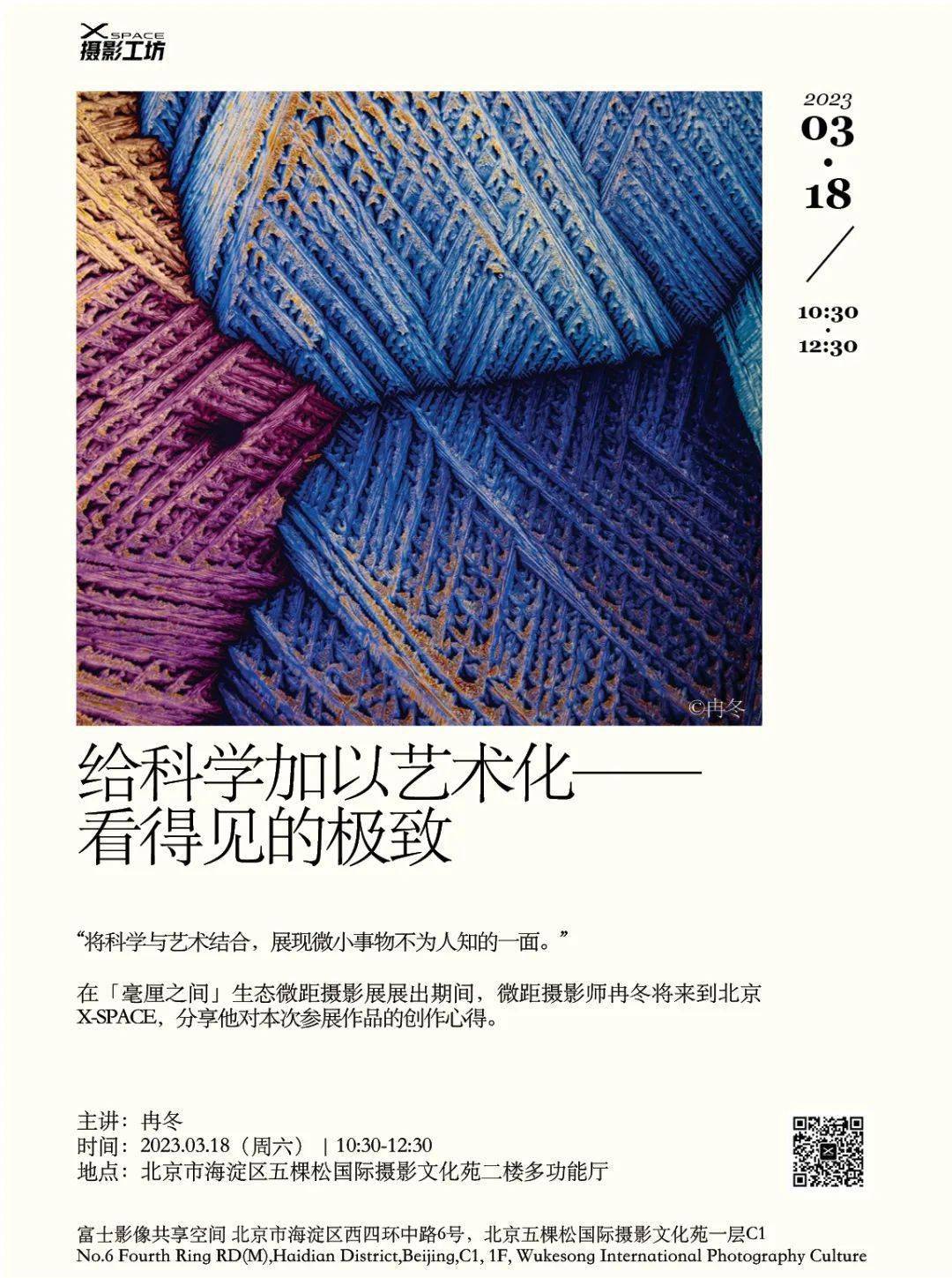 冉冬 微距摄影师 活动时间 2023.3.18(周日)10:30-12:30 活动地点 富士影像共享空间 ·北京 北京五棵松国际摄影文化苑二楼多功用厅 报名方式 本次活动经过 X-SPACE 官方小程序报名 ▽ 点击报名|3/18 冉冬:给科学加以艺术化——看得见的极致 本次活动免费参与 报名完成后将会经过富士数码影像官微与您确认 (报名请务必确保所留电话号码正确) 「毫厘之间」 生态微距摄影展 2023.3.10 — 2023.3.28 X-SPACE富士影像共享空间 一花一世界,一叶一菩提。 微距摄影从小到看不见的藜麦籽,到海洋中的海兔纹路,从闪蝶的绚丽翅膀到形态万千的钝头蛇,将微小物体尺度放大数倍,展示物体次序结构和颜色的真实之美。 此次参展的7位摄影师经过对自然野外多种动植物、海洋生物以及无生命体的察看与发现,探寻生态自然中的关系连结,将自己的视角与了解透过富士相机镜头创作呈现,讨论从有机生命体到无机物之间,自然环境与人类之间的关系。 摄影师们经过富士X系列无反数码相机和GFX系列无反中画幅数码相机,将肉眼难以察觉的微观细节展示得淋漓尽致。同时,富士关于物体颜色有极端出色表示力,圆满恢复了拍摄对象真实原貌的靓丽颜色。 - 部分参展作品 - (以下按首字母排序)