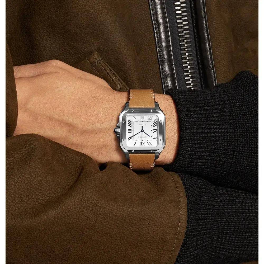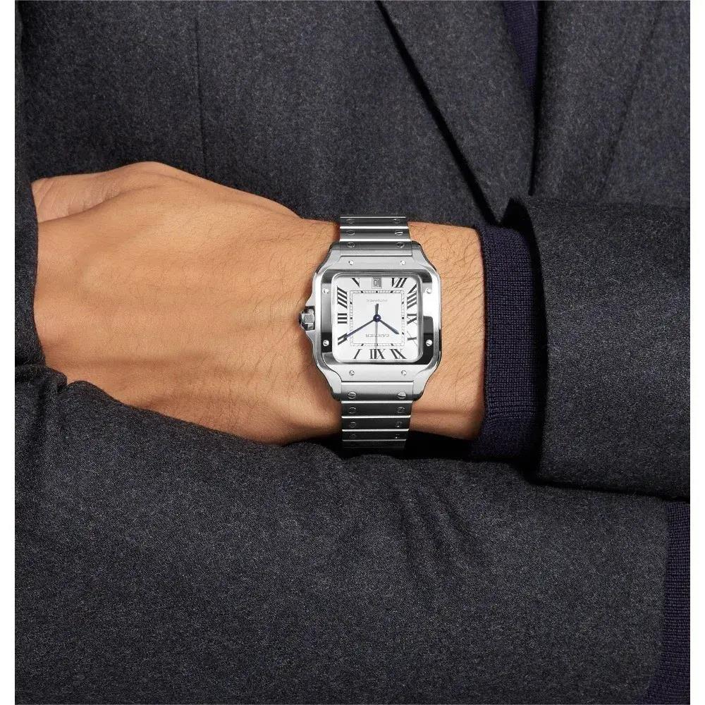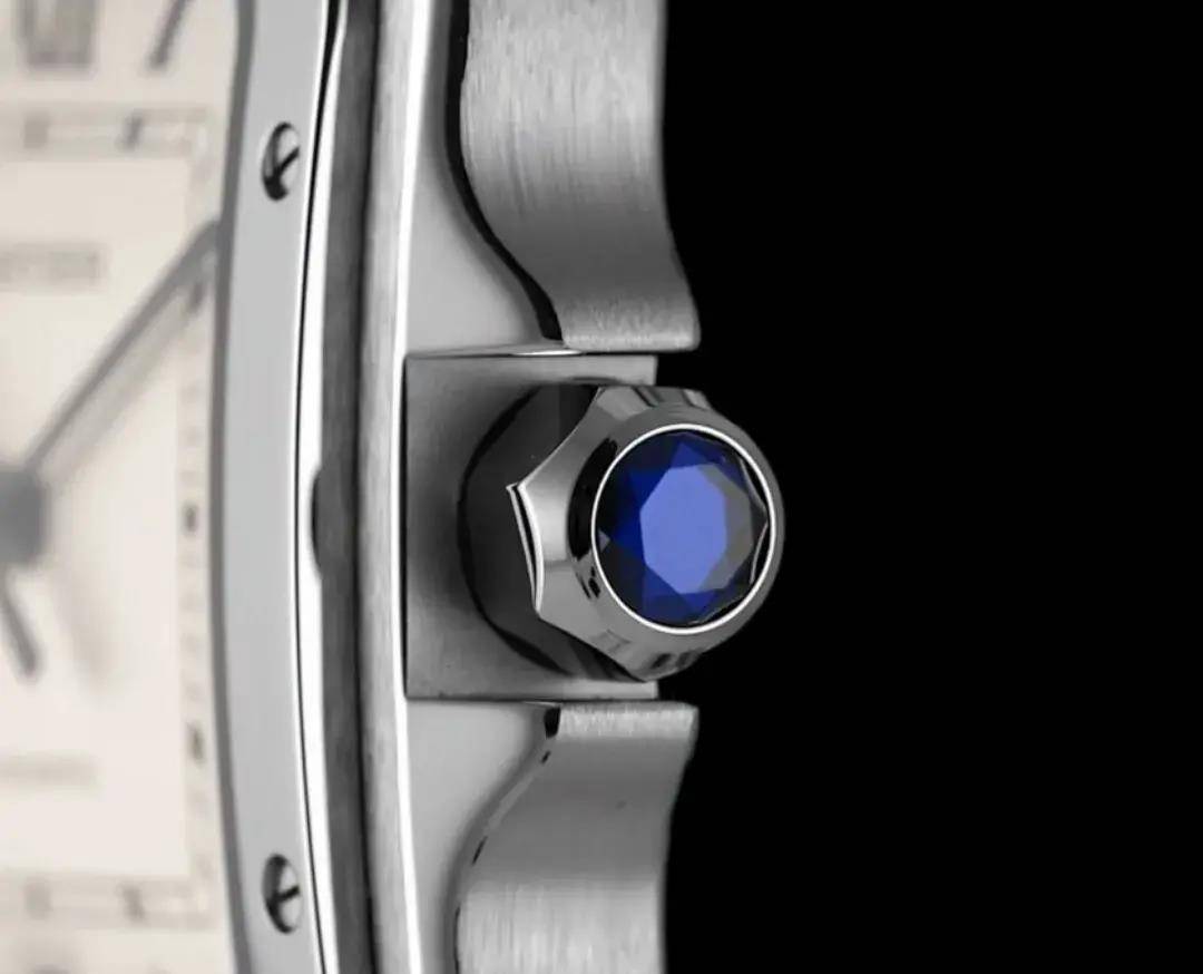 尺寸方面这款大号山度士应用了39.8mm的表径,不外即便如此,由于方形腕表的特质,这款腕表的上表耳与下表耳之间也有47.5mm的距离,尺寸还是较大,但弧形的设计却使这款腕表在佩戴后十分贴合皮肤。仅有9mm的表壳厚度值得称誉的,看来卡地亚为了打造简约的正装绅士没少在精简尺寸上下功夫。