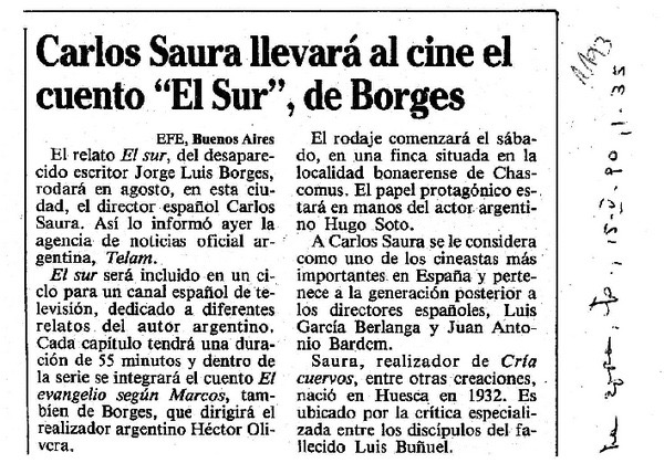 《波尔多的愿望天堂》 安东尼奥·卡斯特罗:您第三次在拉丁美洲拍片的契机是对《南方》的改编。 卡洛斯·绍拉:是的,正如你所知,剧本不是我的,而是维克多·艾里斯[1](Víctor Erice)的。我和安德烈斯预先中止了改编。我将这部电影归在我怀有特殊感情的电影类别之中。《南方》《黑夜》《被蒙上的双眼》《艾丽莎,我的爱》都是十分细腻和具有个人颜色的电影。