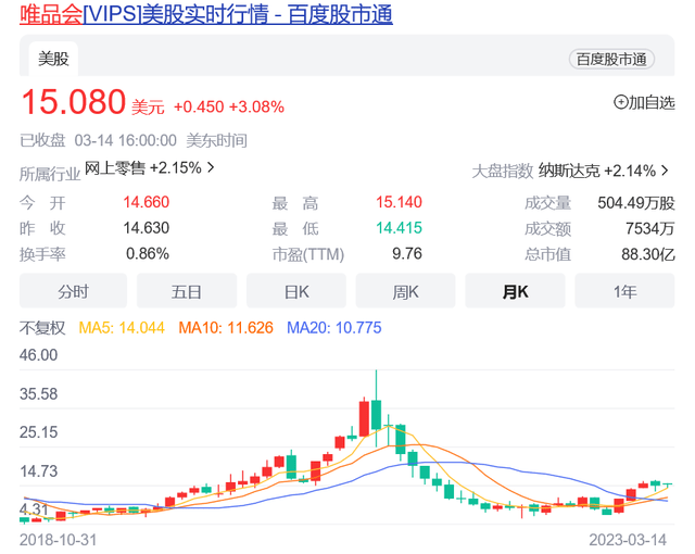 2022年,唯品会Non-GAAP(非美国通用会计准绳下)净利润为68亿元,同比增长14%。 值得一提的是,2022年,唯品会生动客户数8480万,比上年少了910万,同比降落了9.7%;2022年第四季度唯品GMV和生动用户数量分别为544亿元和4770万,较2021年同期分别减少26亿元和150万。 总之,“降本增效”的唯品会,2022年是“冰火两重天”的一年,好的很好,差的也的确不美观,但还算稳健。财报发布后,次日唯品会股价上涨5%。 贰 自2012年3月上市以来,唯品会股价阅历了三起三落,最高时唯品会股价曾抵达46美圆/股(2021年3月23日盘中),而到今年2月23日收盘时仅剩8.665美圆/股,不到一年时间股价缩水81%,市值蒸发超越1600亿元。