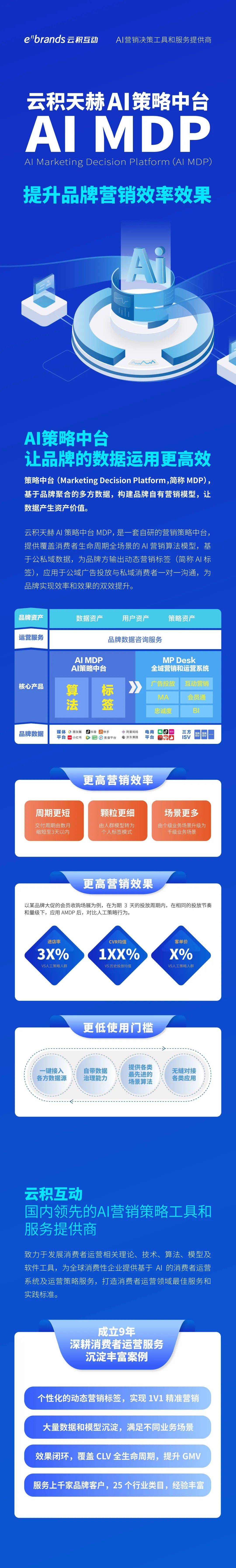 云积天赫AI战略中台(AI MDP) 云积天赫AI战略中台(AI MDP)是业界第一款AI MDP产品,有效提升营销的效率、效果,降低品牌数据运用的门槛,完成品牌增长的确定性。 第一,提升品牌营销效率。在更短的托付周期内,完成人群模型向个人标签方式转化,满足千级业务场景; 第二,提升品牌营销效果。对比人工战略行为,在进店率、CVR均值等方面完成提升; 第三,打通技术链路,进一步降低应用门槛。一键接入各方数据源,自带数据管理才干,提升各类最先进的场景算法,无缝对接各类应用。