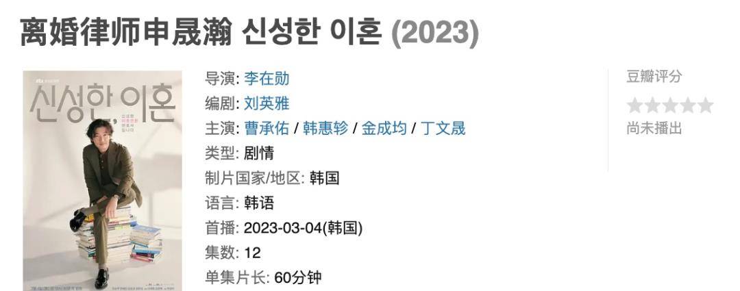 曹承佑主演的新剧也是本月值得关注的韩剧。该剧的编剧刘英雅曾担任《7号房的礼物》《82年生的金智英》《结婚礼服》等影片的编剧。所以阵容配置还是很不错的。 剧情简介来自豆瓣,大家也能够了解一下: 该剧是依据同名网络电影改编的离婚案件改编的电视剧。讲述了男主接到从音乐大学教授到离婚律师的各种离婚诉讼的故事。韩慧珍在剧中饰演气候主播。打碟机。