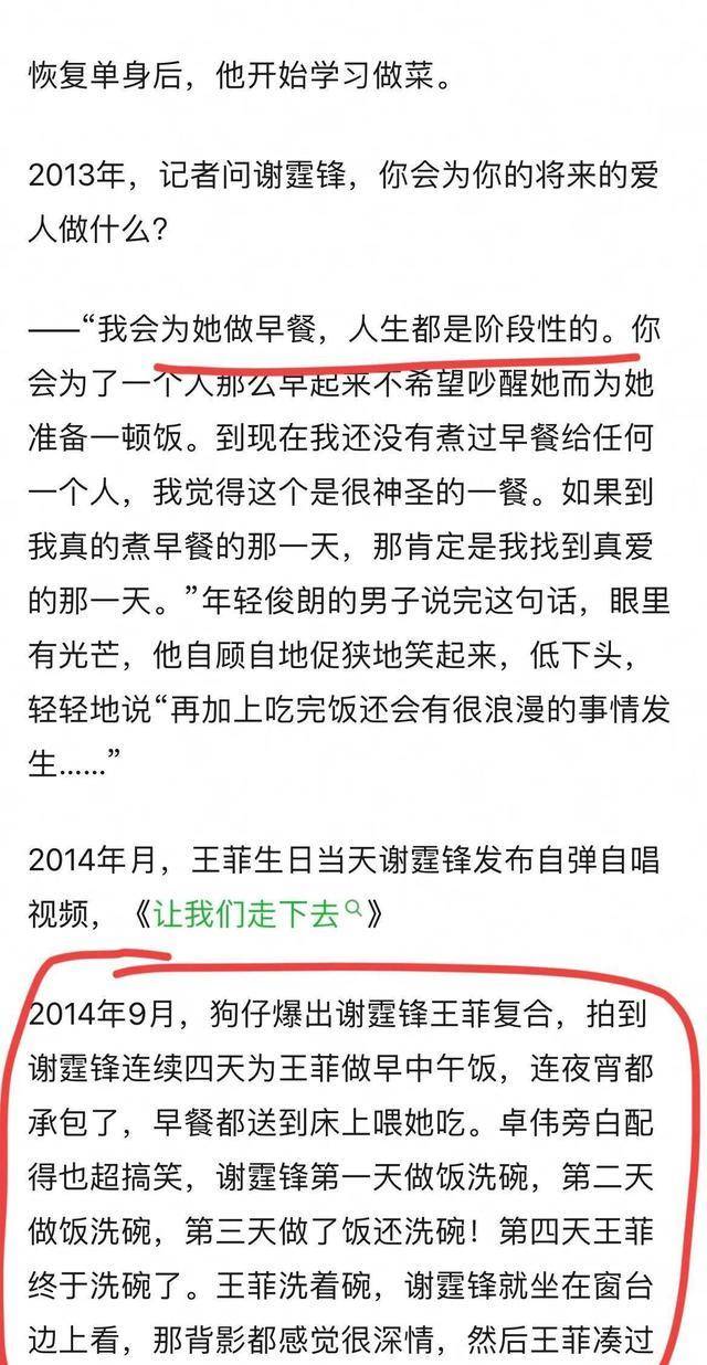 有狗仔爆出谢霆锋连续四天为王菲做早餐、午餐和晚餐。