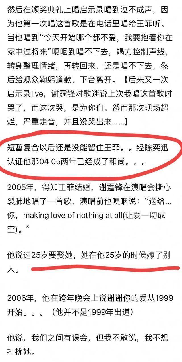 2005年,王菲和李亚鹏宣布结婚。这一年谢霆锋25岁。他曾说过,今年要将心爱的女人娶回家,却没想到,只能眼睁睁地看着她嫁给他人。 不知道是由于失意还是其他缘由,一年后,谢霆锋和张柏芝正式宣布结婚。 后来,他们俩都有了自己的家庭,有了自己的孩子。