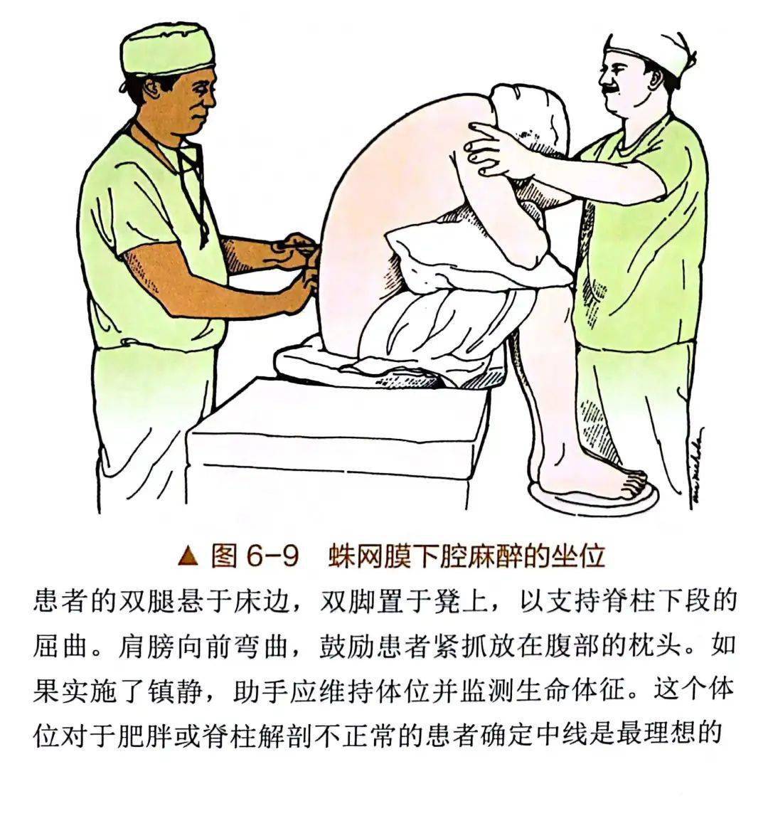 事实上,重比重局麻药汇集在胸椎后凸处可解释最高觉得阻滞平面位于中胸部。 两种值得讨论的体位: a.为限制药物散布至腰骶皮区,不时(错误地)倡导患者坐位下注入重比重局麻药(5 ~ 10min),产生所谓的“鞍区阻滞”(图6-9)。