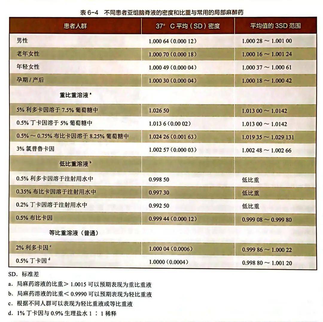 注射后,局麻药最初经过单纯的药物整体活动扩散。随后,影响散布的最重要要素是局麻药的比重。其他相关要素包含总剂量、注射IVS(椎间隙)和患者特征。 (1)比重:比重定义为局麻药溶液与CSF在37℃时的密度之比。局麻药溶液与CSF密度相同称为等比重。局麻药溶液的密度比CSF大,称为重比重,而比CSF密度低的溶液称为低比重。 重比重液会下沉到蛛网膜下腔的最依从区域,而低比重液会上升到非依从区。重力效应由选择的患者体位和脊柱的自然曲度决议。CSF的平均密度在不同患者人群中变更很大(表6-4)。