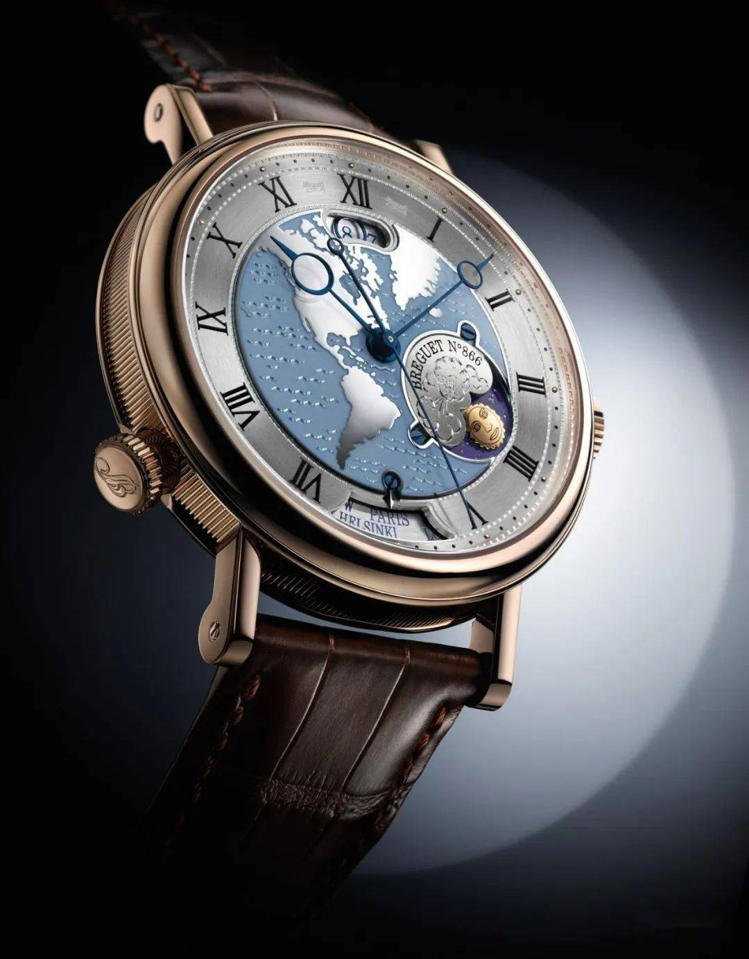 2,双时区功用同时,多个极具把玩性和兴味性的细节功用、装饰设计。 一块好表,要有适用和必须的功用,也要好玩和兴味----在单独面对它、由它陪伴时,常常能够和它一同“游玩”,观赏它、把玩它,其乐无量。 12点位共同的日历转换和显现十分有趣,3点位和4点位间的日夜转换盘的画面设计很心爱、拟人“人脸”日夜指针的转换同样有趣和心爱,让在全球城市间奔忙差旅的胜利人士们,在看到这款表表盘上此类细节时,都能心旷神怡。看似简单,但这类暨适用又兴味的高级美学设计,只需宝玑这类造诣极深的品牌才干想到并付诸实施。 说起兴味, 宝玑“ Hora Mundi ”双时区腕表中心小表盘上装饰的平面镜面地球画面,也是一大亮点。而且,这款双时区腕表,依据你所在的区域,你还能够选择“你的地图”,有“EU”(欧洲)、“US”(美洲)、“AS”(亚洲)几个主要选择,十分适用和有趣。