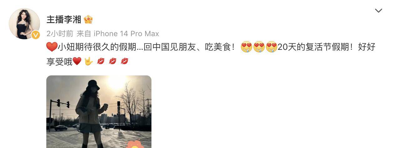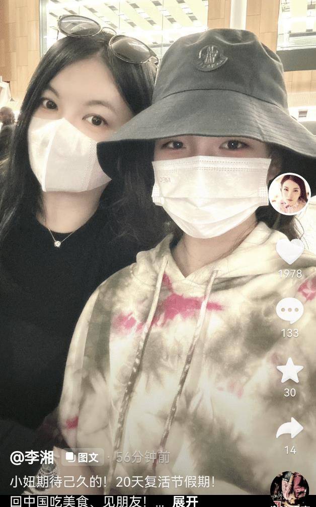 3月19日,李湘晒出与女儿的合照,并写道:等候已久的20天复生节假期!回中国吃好吃的,见朋友。好好享用! 这也是王诗龄去年留学英国后初次回国。