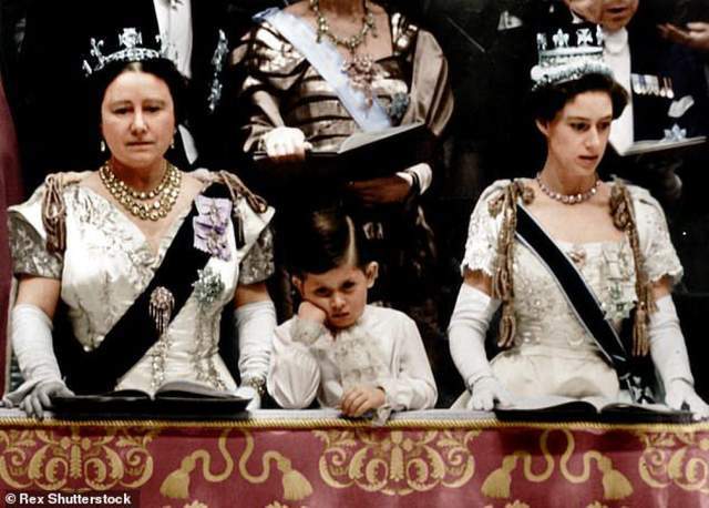 1953年女王加冕时,查尔斯也刚刚4岁。固然未担任什么角色,但他衣着定制礼服,拄着胳膊宁静地站在外婆伊丽莎白王太后和小姨玛格丽特公主中间,观看了妈妈的加冕礼。