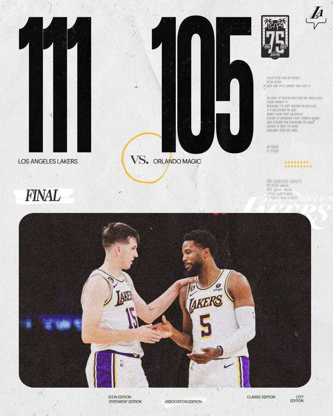 里夫斯出战30分钟,14投9中,三分4中1,罚球18中16,狂砍35分6板6助!单场35分发明生活新高,本场正负值+25并列全队最高。湖人替补球员一共砍下61分,超越全队一半的分数,魔术替补仅得26分。祝贺湖人,升至西部第10。