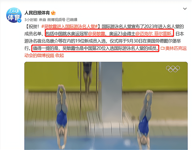据悉,2023年国际游泳名人堂一共有19人入选,其中就包含跳水名将吴敏霞和游泳名将菲尔普斯,颁奖仪式将在9月30日举行,地点是在美国劳德代尔堡,届时,吴敏霞肯定盛装列席名人堂颁奖仪式,她也是大家心目中的自豪。吴敏霞也成为国内第20位入选国际游泳名人堂的运发起,关于吴敏霞来说,置信她曾经等候这一刻很久了。
