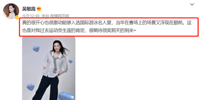 吴敏霞也在社媒上发布感激词,并且很等候名人堂颁奖仪式。“真的很开心也很及藕丁能够入选国际游泳名人堂,当年在赛场上的场景又浮往常眼前,这也是对我过去运发起生活的肯定,很等候领奖那天的到来”。