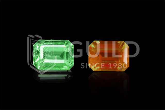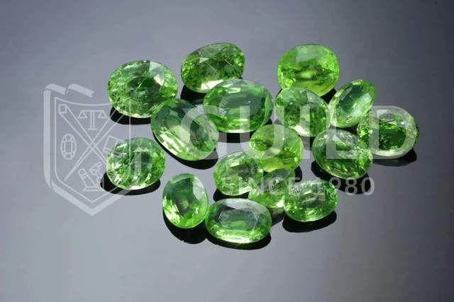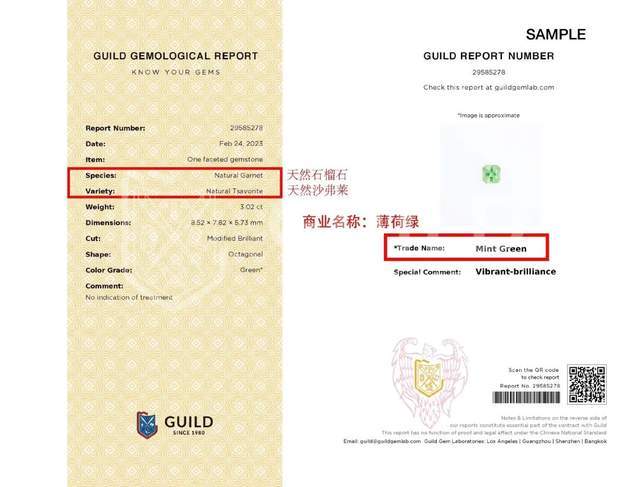 “Mint Green”(薄荷绿)沙弗莱及其荧光 图源GUILD 在宝石买卖市场常常会将这种薄荷绿色的石榴石称为“Mint Garnet”(薄荷榴石)。“Mint Green”(薄荷绿)代表的是清新、明亮的一种绿色,与沙弗莱灵动的气质不约而同。