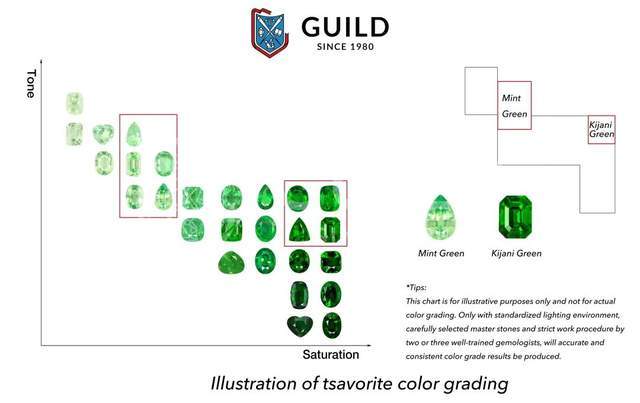 Guild沙弗莱颜色分级体系色卡 图源版权GUILD “Kijani Green”在斯瓦西里语中代表充溢希望明亮的绿色。这是沙弗莱主要产地肯尼亚与坦桑尼亚主体民族之一的斯瓦西里人给予绿色的最高评价。