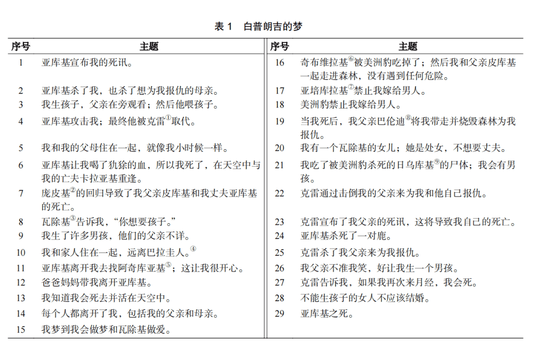 塞巴格自己充沛认识到了这项研讨的特别之处。他在文章伊始就指出:“本文与经典的民族学研讨有明显区别。”他也在脚注里阐明,固然与克拉斯特同时展开对该族群的田野调查,但关于梦的研讨是自己单独完成的。因而,与塞巴格的其他作品不同(早期的《马克思主义和结构主义》基于地道的理论辨析,对普韦布洛印第安人的神话学研讨更多是在列维斯特劳斯指导和监视之下的集体创作),这篇论文能够看作是一项相对独立的研讨成果,集中表示了塞巴格的个人作风与思想。 作者如是表述文章的宗旨: 在搜集这些文本时,我主要关注两个问题:一是民族志,我试图经过剖析特定个体对瓜亚基文化构成要素的吸收、理论和转化,来控制该文化的某些特性;二是肉体剖析,我讨论主体如何运用其文化允许访问的、一定数量的优先能指,来展开出自己的问题——其剖析可能有助于确认或承认弗洛伊德肉体剖析的某些论点。 在塞巴格看来,个体与其文化的关系既是高度结构化的,也是辩证的。一方面,文化为个体提供了某种既定、武断的符号系统(“优先能指”);另一方面,经过部分地吸收、理论和转化这一系统,个体得以提出自我关怀的问题,从而完成主体能动性。但是在这里更重要的是,作者试图借此冲破人类学与肉体剖析的藩篱。由于在研讨对象上,两者都面临文化与个体的复杂关系;在认识论层面,关于悠远异文化的民族志学问与弗洛伊德的理论之间,能够相互印证、揣摩;最后——或许也是最重要的——是研讨措施,由于无论是针对文化还是个体,“剖析(analyse)”总是指向某种基于有限符号——例如话语和文本——的诠释学(hermeneutics)。由上所述,梦或者对梦的剖析显然是理想的交叉研讨议题。难怪这位年轻的学者充溢自信地宣称,经过持续集中的调查,该研讨“毫无疑问地提示了那些在普通察看和访谈中被躲藏的文化构成”。 在转向塞巴格的细致剖析之前,有必要先扼要引见阿谢人的历史、社会与文化特征。他们生活在巴拉圭西部的森林中,主要从事狩猎和采集,传统上是游牧族群。早在17世纪,耶稣会的传教士对阿谢人的活动已有记载。随着殖民者的不时扩张,特别是20世纪巴拉圭军事专制者阿尔弗雷多·斯特罗斯纳·马蒂奥达(Alfredo Stroessner Matiauda)上台,大量阿谢人被杀害、绑架、贩卖,人口和领地锐减。1950年代,巴拉圭农场主马努埃尔·培伊雷拉(Manuel Peyreira)在瓜伊拉省(Guairá Department)开辟了一块空地,宣称对这些印第安人实施“维护”。先后有两个阿谢群体——“阿谢·噶图(Aché Gatu)”和“阿谢·克维拉(Aché Kwera)”——放弃了游牧生活,来此定居。在塞巴格和克拉斯特去往该地域展开田野调查时,前者已定居了四年,后者刚刚一年。 阿谢人的群体通常不超越100人,彼此很少接触。每个群体由若干个亚群体组成,后者包含几个平常共同狩猎的家庭。作为营地,他们用椰子树的枝叶在森林中搭建简单的居所,可容纳几人到十几人。阿谢人实行多偶制,依据性别比例,既有一妻多夫,也有一夫多妻的家庭。因而一个孩子常常有两个以至三个父亲。阿谢人的性行为是高度自由的。 阿谢人崇尚生育男孩。有些女孩出生即被杀死,或者沦为其父亲或母亲被复仇时的附带牺牲品。男孩在十三四岁时穿唇,视作已成年,能够狩猎和结婚。女孩则在月经初潮时举行净化仪式。此外,一切阿谢人在出生时均要举行仪式,并从此与接生者(包含抱婴儿者、给婴儿推拿头部者等)树立终生的联络。阿谢人的姓名跟母亲怀孕期间食用的动物肉类有关,他们通常会选择其中的若干种动物称号作为自己的名字。 阿谢文化中有食人的习俗。在塞巴格和克拉斯特调查的印第安人中,阿谢·噶图在成员死后烹饪和分食其身体,也会吃掉敌人的尸体。另一个群体阿谢·克维拉则采取土葬。死者被吃掉后,骨头被敲碎并扔入火中,以确保其坏的灵魂“伊瓦内(Ivane)”留在森林中,不打扰生者,好的灵魂“欧维(Ové)”则升上天空,与其他死者的灵魂相聚。 最后,阿谢人将复敌视作维持宇宙均衡的中心伎俩。无论人的死亡、自然现象(冰冷、雨水、刮风),还是杀死动物,都可能惹起某种方式的报复,从而构成一连串的连锁反响。例如在父母死后,孩子(通常是女儿)也会被杀死,以确保其灵魂在天空中相聚。 白普朗吉是阿谢·噶图群体的一员。她曾经同时具有两位丈夫:时年31岁的亚库基(Jakugi),以及两年前逝世的卡拉亚基(Krajagi)。白普朗吉的父母仍在世,分别是母亲白普基(Baipugi)和父亲堪德基(Kandegi)。她的另一位父亲皮库基(Pikugi)曾经分开白普基,和别的女人生活在一同。白普朗吉与现任丈夫亚库基关系不和,首先是由于亚库基性格火暴,无法接受与他人分享妻子:卡拉亚基在世时,常常因而爆发抵触;卡拉亚基死后,亚库基发现白普朗吉跟一个年轻人发作性关系,于是殴打了这对情侣。另一个缘由则是白普朗吉没有孩子,事实上她从未怀孕过。 在文章中,塞巴格逐一对白普朗吉对其讲述的29个梦中止了描写与剖析。其方式是相同的:先用第一人称恢复白普朗吉的叙说,然后剖析梦的内容。这些梦的次第和主题如下: 固然以上“梦的记叙(récits des rêves)”遵照一定的时间次第,但这并不意味着梦与梦之间的关系是线性的。相反,某些特定的主题不时地在梦境中浮现、“变形(transform)”和缠绕。用塞巴格的话说,梦实践上彼此“相