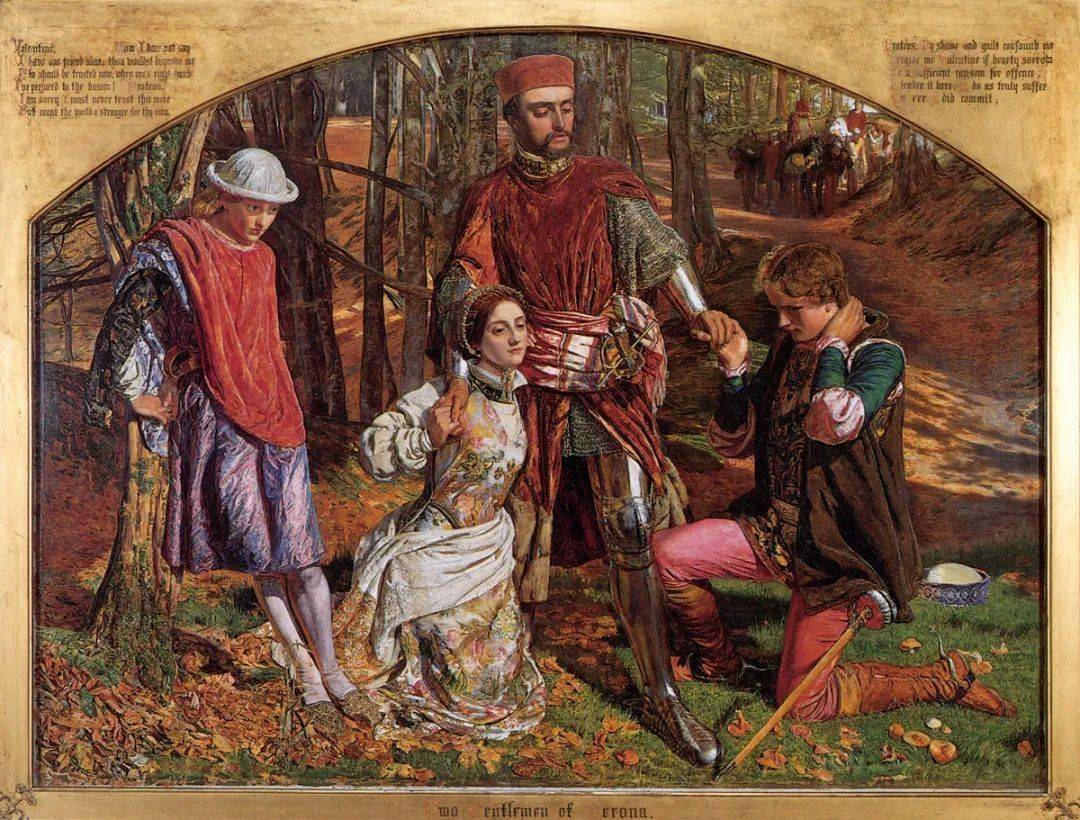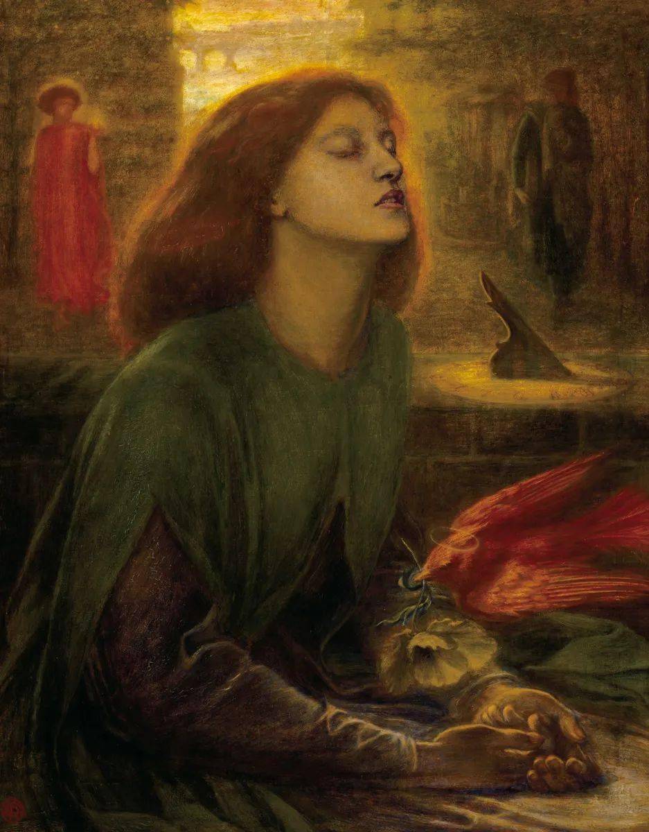 《瓦伦汀从普罗丢斯那里救下西尔维亚》画中展示的是莎士比亚作品《维洛那二绅士》中的一幕,由威廉·霍尔曼·亨特于1851年作。 1852年,丽齐成为但丁·加布里埃尔·罗塞蒂的情人。热恋中的罗塞蒂为丽齐痴狂,为她写诗作画,一切的创作灵感皆因她点燃,但是两人的恋情却不顺遂。罗塞蒂三心二意,经常出轨,丽齐身体虚弱,依赖鸦片酊。两人纠缠多年,直到1860年春天才成婚,可等候他们的却不是童话般的结局。由于长期服用鸦片酊,1861年5月2日,她产下一个死婴,这彻底击垮了丽齐,加上婚姻也呈现问题,她的肉体从此一蹶不振。1862年2月10日晚上,罗塞蒂照常去夜校授课。离家前,他看到丽齐服用了常规剂量的鸦片酊,但当罗塞蒂回到家,发现丽齐沉沉地睡去,基本叫不醒,旁边的鸦片酊瓶全空了。医生竭尽全力也未能救回丽齐,2月11日,伊丽莎白·西达尔逝世,死时已有身孕。 伤心的罗塞蒂将她和自己的诗稿掩埋,但她的脸,却因罗塞蒂的作品《比塔·贝亚特丽丝》而永存:画中的女人紧闭双眼如坠梦中,红色的鸽子嘴衔白色罂粟花丢向她的衣裙,罗塞蒂以此来表白对亡妻的哀思。