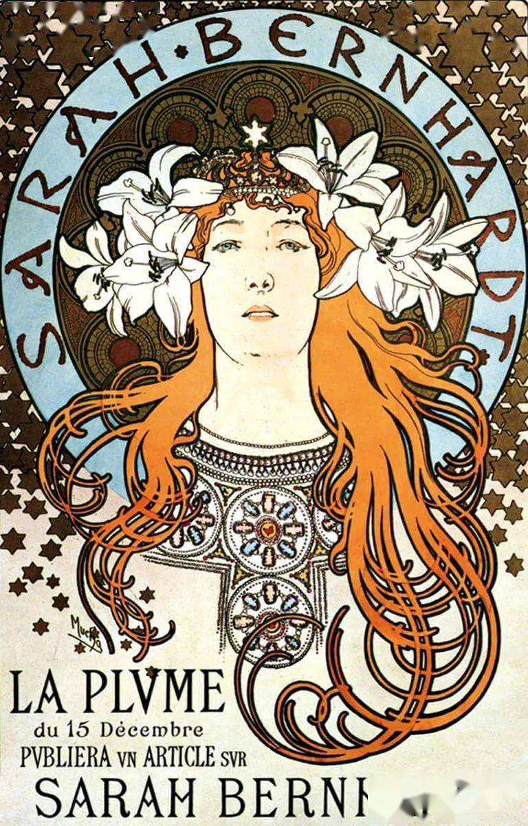 《自画像》 莎拉·伯恩哈特 1910年 而提起阿尔丰斯·穆夏,人们肯定对他画笔下花团锦簇的美貌女性印象深化。这种颜色轻柔明丽、构图动感、视觉元素多样的穆夏作风,得益于他对日本木刻文雅描写轮廓线的学习、对拜占庭艺术华美颜色的吸取,以及巴洛克、洛可可艺术细致的描画手法,更得益于莎拉·伯恩哈特。 这位顶级女星与当时默默无闻的画家的协作,始于1894年圣诞节的清晨。莎拉给出版社打来电话,想为自己在文艺复兴剧院演出的萨尔杜的歌舞剧《吉斯蒙达》定制一张能在年底完成的海报,她请求既能让人了如指掌所表演的角色,又能意味自己。因赶上圣诞节,经理一时找不到适合的人,只好寄希望于担任校正工作的穆夏。于是,他画出了《吉斯蒙达》:身着拜占庭作风的花鸟纹饰镶金及地长袍、头戴粉红色花冠、手执棕榈叶的莎拉伫立在画面正中,好像穿越丛林而来的仙子。1895年元旦,巴黎街头四处都是比真人还要大的《吉斯蒙达》海报,穆夏在一夜之间众所周知,致使于当时巴黎的海报珍藏家会在晚上把海报“偷”回家珍藏。这件作品的胜利使当时34岁、在巴黎苦苦挣扎了7年的捷克摩拉维亚青年从此与贫穷和孤独绝缘。