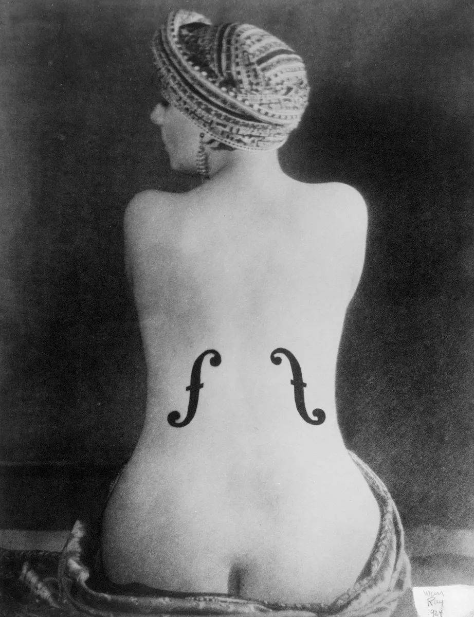 2022年5月14日,《安格尔的小提琴》以1240万美圆的价钱成交,创下史上最昂贵的照片拍卖纪录。 吉吉本名爱丽丝·普林(Alice Ernestine Prin,1901-1953),出生在法国勃艮第-弗朗什-孔泰,母亲是排字工,没人知道她的父亲是谁,由于她是个私生女。14岁起,爱丽丝流浪在巴黎街头,靠做模特、与艺术家们厮混过日子,巴黎艺术世界的大门逐步为她敞开。 画家莫里斯·门吉斯基为她画过许多张肖像,格沃兹德基、莫迪里阿尼雇她做模特,日裔画家藤田嗣治用粉彩手法使她的身体具有了东方魅力……在每个艺术家的雕塑刀、画笔下,吉吉都呈现出不同的侧面。她的凶猛之处在于,她能够在每一个艺术家面前“认真地逢场作戏”,充沛激起他们的创作热情,令他们感到若要表示出吉吉的美好非己莫属。 吉吉与曼·雷的相遇在蒙巴纳斯的一家咖啡店里,作为摄影师的他本能地捕获到了吉吉的美。他约请她看电影、拍照片,而且一发不可收拾。吉吉终了与门吉斯基的同居生活,搬去与曼·相同住。之后曼·雷拍摄了无数幅以吉吉为主角的作品。《安格尔的小提琴》其实是吉吉与曼·雷的共同创作。1924年,吉吉已是巴黎的新星,名气在曼·雷之上。她从实质上发明了将自己变成艺术的想法,经过含糊自我和公众形象之间的界线,供人们在印刷品、画布、舞台、唱片和屏幕上消费。1927年她在画廊举行了个展,取得庞大胜利。1929年,吉吉的事业抵达巅峰。她写了一本回想录,《巴黎论坛报》这样描画她的签售会:“只需花30法郎便能取得一本吉吉亲笔签名的回想录,却需求付出排队9个小时的代价……男人们遗忘自己的另一半,遗忘他们的约会……就是为了赶来排队。”海明威为其回想录作序:“写这本书的女性历来就不是一位淑女,而是女王。无可置疑,吉吉对蒙巴纳斯这一时期的掌控更甚于维多利亚女王对她自己王国的控制。”