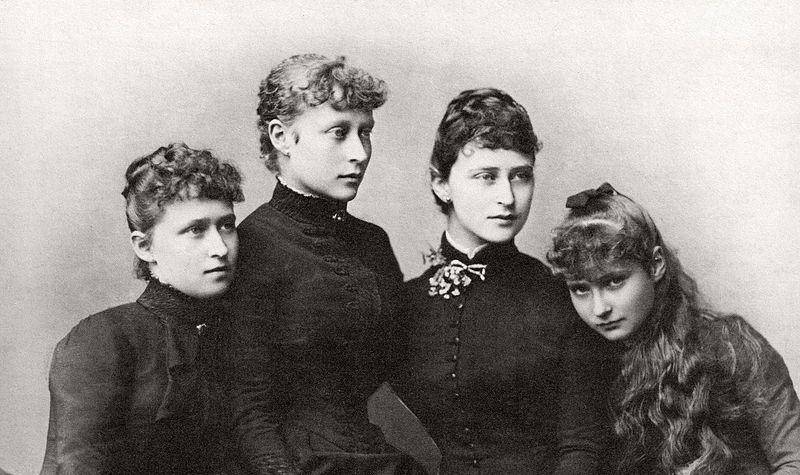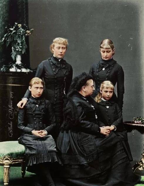 阿丽克丝(右一)和姐姐们 阿丽克丝童年各种不幸:她自己遗传了母家的血友病基因;她的血友病哥哥弗里德里希王子两岁半死于内出血;她六岁那年,母亲和小妹死于白喉。 原本高兴明朗的她从此变得阴霾寡言。