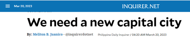 据《菲律宾每日讯问者报》的报道,随着南海局势日渐慌张,菲律宾开端有人倡议小马科斯政府“迁都”,把行政中心转移出马尼拉,持相似观念的,恐怕还不在少数。