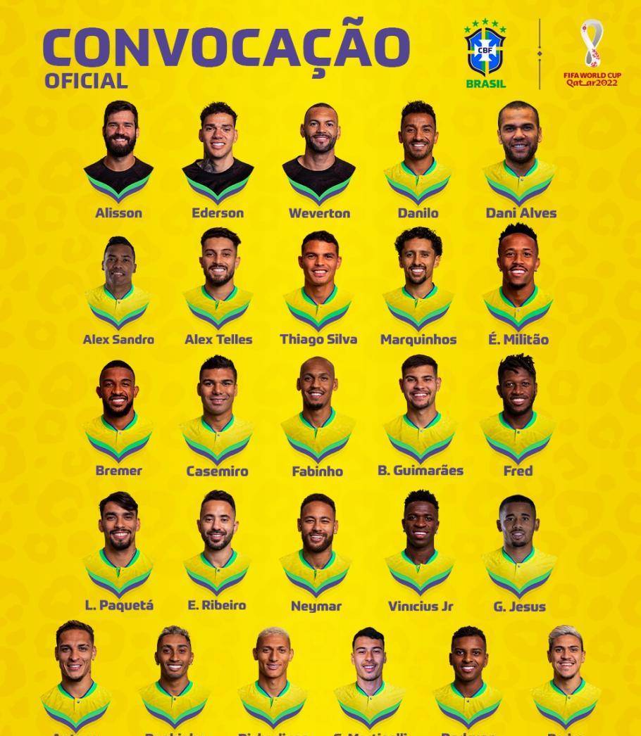 巴西大名单 主教练:蒂特 门将(3人):1-阿利森(29岁、利物浦—英超)、23-埃德森(29岁、曼彻斯特城—英超)、12-韦弗顿(34岁、帕尔梅拉斯—巴甲) 后卫(8人): 2-达尼洛 (31岁、尤文图斯—意甲) 、13-阿尔维斯(39岁、美洲狮—墨甲)、 6-桑德罗 (31岁、尤文图斯—意甲) 、 16-特莱斯 (29岁、塞维利亚—西甲)伤退 、3-蒂亚戈-席尔瓦(37岁、切尔西—英超)、4-马尔基尼奥斯(28岁、巴黎圣日耳曼—法甲)、14-米利唐(24岁、皇家马德里—西甲)、24-布雷默(25岁、尤文图斯—意甲) 中场(6人):5-卡塞米罗(30岁、曼彻斯特联—英超)、15-法比尼奥(28岁、利物浦—英超)、17-吉马良斯(24岁、纽卡斯尔联—英超)、8-弗雷德(29岁、曼彻斯特联—英超)、7-帕奎塔(25岁、西汉姆联—英超)、22-里贝罗(33岁、弗拉门戈—巴甲) 前锋(9人):10-内马尔(30岁、巴黎圣日耳曼—法甲)、20-维尼修斯(22岁、皇家马德里—西甲)、 18-热苏斯 (25岁、阿森纳—英超)伤退 、19-安东尼(22岁、曼彻斯特联—英超)、11-拉菲尼亚(25岁、巴萨罗纳—西甲)、9-理查利森(25岁、热刺—英超)、26-马丁内利(23岁、阿森纳—英超)、21-罗德里戈(21岁、皇家马德里—西甲)、25-佩德罗(25岁、弗拉门戈—巴甲) 3.升级之路
