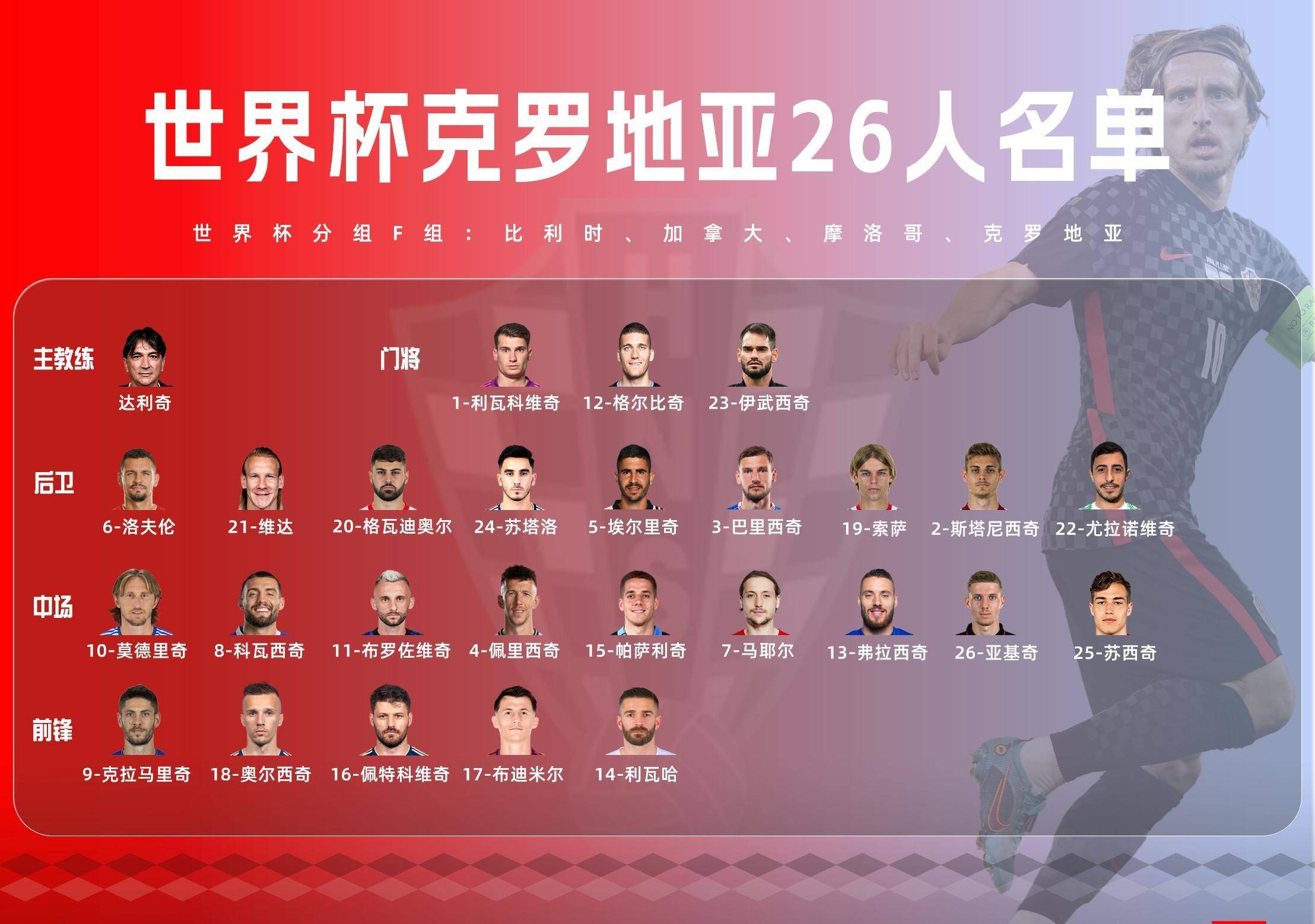 克罗地亚大名单(图片来源:直播吧) 主教练:兹拉特科·达利奇 门将(3人):1-利瓦科维奇(27岁/萨格勒布迪纳摩/克甲)、12-格尔比奇(26岁/马德里竞技/西甲)、23-伊武西奇(27岁/奥西克耶/克甲) 后卫(9人):2-斯坦尼西奇(22岁/拜仁慕尼黑/德甲)、3-巴里西奇(29岁/流浪者/苏超)、5-埃尔里奇(24岁/萨索洛/意甲)、6-洛夫伦(33岁/泽尼特/俄超)、19-博尔纳-索萨(24岁/斯图加特/德甲)、20-格瓦迪奥尔(20岁/莱比锡/德甲)、21-维达(33岁/AEK雅典/希腊超)、22-尤拉诺维奇(27岁/凯尔特人/苏超)、24-舒塔洛(22岁/萨格勒布迪纳摩/克甲) 中场(8人):7-马耶尔(24岁/雷恩/法甲)、8-科瓦西奇(28岁/切尔西/英超)、10-莫德里奇(37岁/皇家马德里/西甲)、11-布罗佐维奇(29岁/国际米兰/意甲)、13-弗拉西奇(25岁/都灵/意甲)、15-帕萨利奇(27岁/亚特兰大/意甲)、25-苏西奇(20岁/萨尔茨堡/奥甲)、26-亚基奇(25岁/法兰克福/德甲) 前锋(6人):4-佩里西奇(33岁/热刺/英超)、9-克拉马里奇(31岁/霍芬海姆/德甲)、14-利瓦贾(29岁/哈伊杜克/克甲)、16-佩特科维奇(28岁/萨格勒布迪纳摩/克甲)、17-布季米尔(31岁/奥萨苏纳/西甲)、18-奥尔西奇(29岁/萨格勒布迪纳摩/克甲) 2.巴西 巴西国度男子足球队世界排名第1,世界杯26人平均年龄27.8岁,总身价11.4亿欧元。巴西共20次入围世界杯决赛圈(含2022年卡塔尔世界杯),巴西队11次进入4强7次杀入决赛,在958年、1962年、1970年、1994年、2002年5次夺得世界杯冠军。在2018年俄罗斯世界杯上巴西队发挥不佳,最终屈居第6名。#秀出你的世界杯主队#
