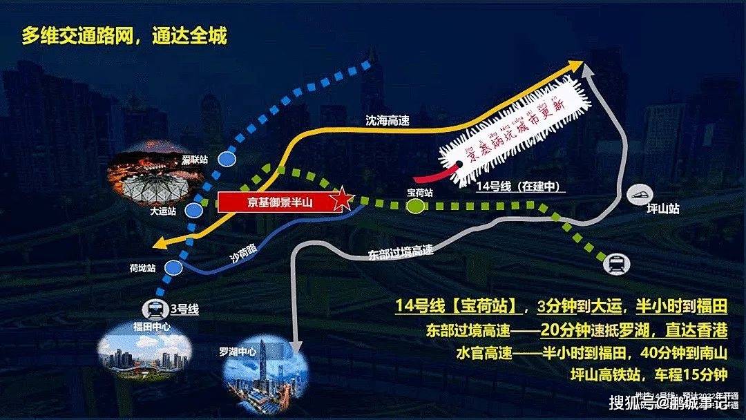 地铁轨道交通: 项目地铁规划【14号线宝荷站零距离】(在建,已全线贯串,2022年底开通运营,线路全长约50公里,总设17个站,全国首列无人驾驶快速地铁,时速高达120码{正常地铁时速80码},1站到大运站,9站进福田,地铁到福田中心大约25分钟)。